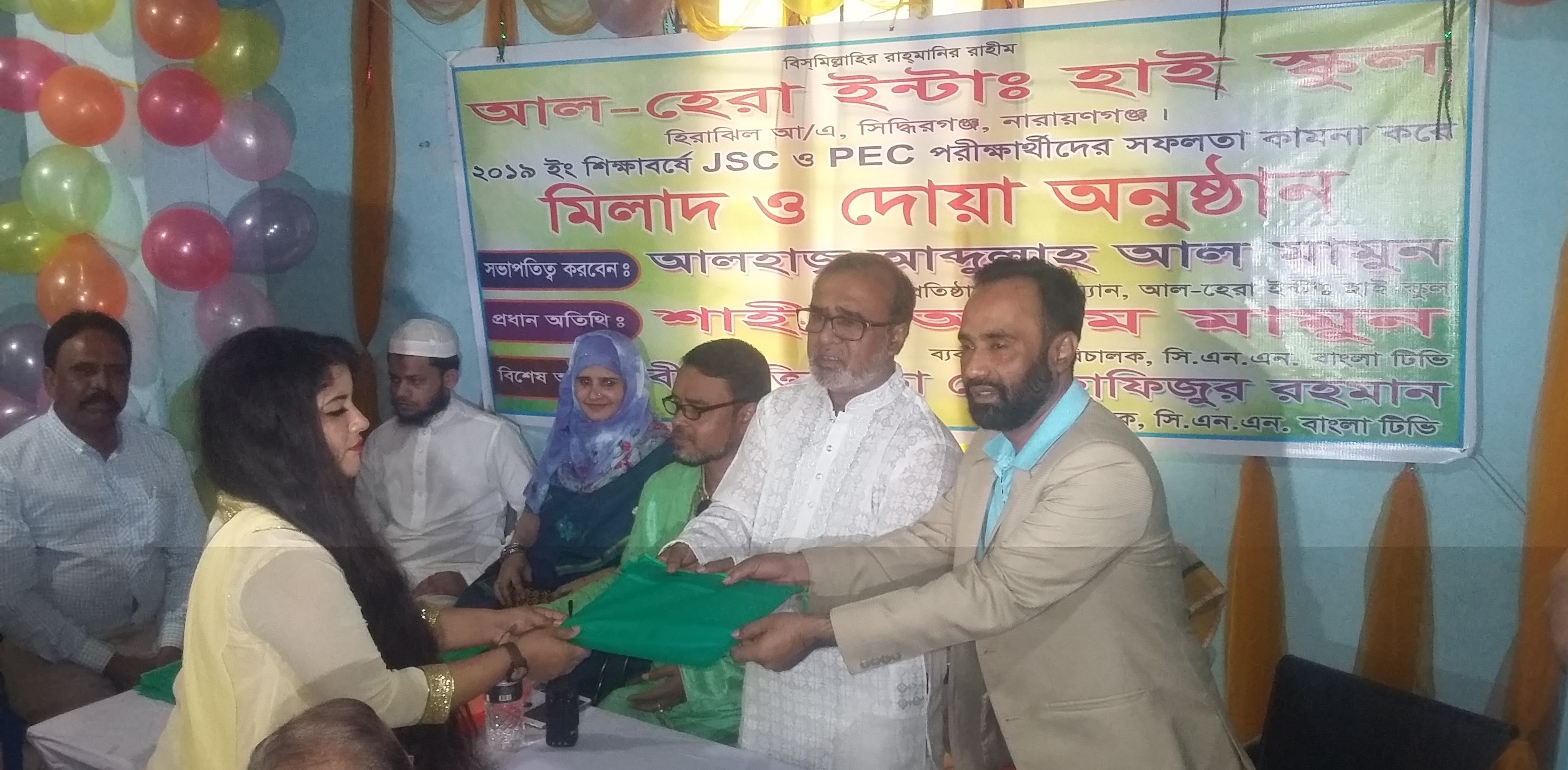 নারায়ণগঞ্জ প্রতিনিধি : সিদ্ধিরগঞ্জ হীরাঝিল আবাসিক এলাকায় অবস্থিত আল-হেরা টাওওয়ারের চতুর্থ তলায় আল-হেরা ইন্টার ন্যাশনাল হাই স্কুলের ২০১৯ সালের জিএসসি ও পিএসসি পরীক্ষার্থীদের সফলতা এবং ভালো ফলাফলের জন্য দোয়া ও মিলাদ মাহফিল অনুষ্ঠিত হয়েছে। শনিবার সকাল ১২ টায় হীরাঝিল আল-হেরা টাওয়ারের স্কুল কক্ষে এই দোয়া অনুষ্ঠিত হয়। আল-হেরা ইন্টারন্যাশনাল হাই স্কুলের প্রতিষ্ঠাতা ও সিএনএন বাংলা টিভির পরিচালক আব্দুল্লাহ আল মামুনের সভাপতিত্বে প্রধান অতিথি হিসেবে উপস্থিত ছিলেন, সি এন এন বাংলা টিভির ব্যবস্থাপনা পরিচালক শাহীন আলম মামুন। বিশেষ অতিথি হিসেবে উপস্থিত ছিলেন, সিএনএন বাংলা টিভির পরিচালক সাখাওয়াত হোসেন মামুন, কৃষিবিদ মজিবুর রহমান, সিদ্ধিরগঞ্জ সাংবাদিক ক্লাবের সভাপতি ও গ্লোবাল টেলিভিশনের নারায়ণগঞ্জ প্রতিনিধি এবং অপরাধ বিচিত্রার স্টাফ রিপোর্টার সাইফুল্যাহ মোঃ খালিদ রাসেল, সাধারন সম্পাদক ও আমার সংবাদ পত্রিকার সিদ্ধিরগঞ্জ প্রতিনিধি আমির হোসেন, বিশিষ্ট ব্যবসায়ী ওসমান গনি প্রমূখ। এদিকে স্কুলটি শিক্ষক ও শিক্ষিকাদের মধ্যে উপস্থিত ছিলেন, প্রধান শিক্ষক মাসুদ হোসেন মানিক, সাব্বির হোসেন, ফরিদা আক্তার, মমতাজ আক্তার, শিউলী আক্তার, শিলা আক্তার, মনিরা আক্তার, রাশিদা আক্তার এবং আকলিমা আক্তার। আল-হেরা ইন্টান্যাশনাল হাই স্কুলের প্রতিষ্ঠাতা আব্দুল্লাহ আল মামুন বলেন, গত বিশ বছর যাবৎ তিল তিল করে স্কুলটি সুনামের সাথে গড়ে তুলেছি। তখন স্কুলটি টিনশেডের ছিলো। টাকার জন্য নয়, একজন শিক্ষিত বেকার ছেলে ও মেয়ে যেন শিক্ষকতার মাধমে শিক্ষার আলো জ¦ালাতে পারে সেই জন্য স্কুল করা। এই শিক্ষার ব্যবস্থা কারায় যেমন আখেরাতে ভালো কিছু পাওয়া যাবে ঠিক এই দুনিয়াতেও ভালো ফলাফল পাওয়া যাবে। পড়াশোনার মান আরো বৃদ্ধি করার জন্য শিক্ষক ও শিক্ষিকাদের আহবান জানান। এসময় শিক্ষিকা এবং ছাত্ররা পবিত্র কোরআন তেলাওয়াত ও ইসলামিক গান পরিবেশন করেন এবং পরীক্ষীর্থীদের মাঝে পরীক্ষার ব্যাগ তুলে দেন। বিশেষ মুনাজাতের মাধ্যমে অনুষ্ঠানটি সমাপ্ত করা করা হয়।