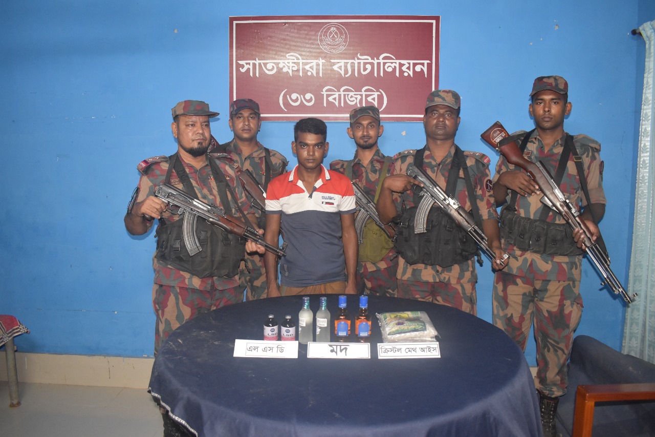 সাতক্ষীরার কলারোয়া সীমান্ত দিয়ে ভারত থেকে বাংলাদেশে পাচারকালে ২ কেজি ভারতীয় ক্রিস্টাল মেথ আইস, ২ বোতল এলএসেডি এবং ৪ বোতল বিদেশি মদসহ ইমন (২৩) নামে এক চোরাকারবারিকে আটক করেছে বিজিবি।