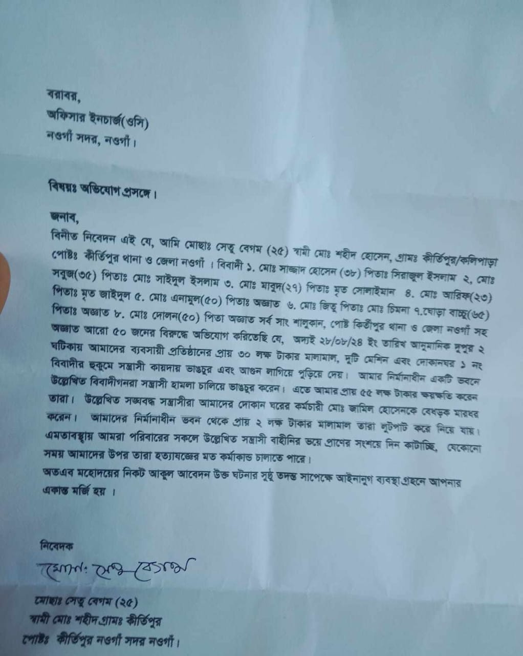 অভিযোগসূত্রে জানা যায়, গত ২৮ আগষ্ট দুপুর ২ টার দিকে নওগাঁ সদর উপজেলার কীর্তিপুর/ কলিপাড়ার মো: শহিদ হোসেন এর স্ত্রীর নির্মানাধীন বসতবাড়ি ও ফার্নিচারের দোকানে হামলা করে একই উপজেলার শালুকান গ্রামের সিরাজুল ইসলামরে ছেলে সাজ্জাদ হোসেন, সাইদুল ইসলামের ছেলে সবুজ, মৃত সোলাইমানের ছেলে মো: মাবুদ, মৃত জাইদুল ইসলামের ছেলে আরিফ, মো: এনামুল, মো: চিমনা ছেলে মো: জিতু, ঘোড়া বাচ্চু, দোলনসহ অন্তত ৫০ জন। এসময় নির্মানাধীন বাসা ও দোকানের প্রায় ত্রিশ লক্ষ টাকার মালামাল , ২ টি মেশিন সন্ত্রাসী কায়দায় ভাংচুর, লুটপাট করে আগুন লেগে দেওয়া হয়। এতে ভূক্তভোগীর প্রায় ৫৫ লক্ষ টাকার ক্ষয়-ক্ষতি হয়। শুধু তাই নয় এসময় দোকানের কর্মচারী আব্দুল জলিল কে বেধরক মারপিট করা হয়।