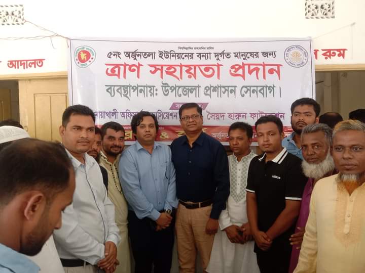 নোয়াখালীর সেনবাগ উপজেলা প্রশাসনের ব্যবস্থাপনায় ৫নং অর্জুনতলা ইউনিয়ন পরিষদ কার্যালয়ে ত্রাণ সামগ্রী বিতরণ করা হয়।