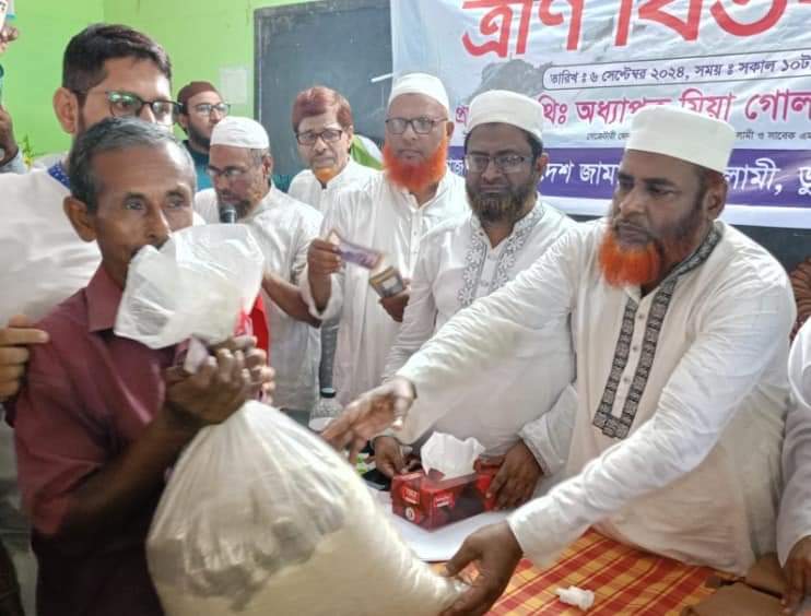 ডুমুরিয়া উপজেলা শরাফপুর ইউনিয়নের বানিয়াখালী উচ্চ বিদ্যালয়ের অডিটোরিয়ামে উপজেলা আমীর মাওলানা মোক্তার হোসেন এর সভাপতিত্বে ও সেক্রেটারি মাওলানা হাবিবুর রহমান এর পরিচালনায় বক্তব্য রাখেন কেন্দ্রীয় মজলিসে শূরার সদস্য ও খুলনা জেলা আমীর মাওলানা এমরান হুসাইন, কেন্দ্রীয় মজলিসে শূরার সদস্য ও মহানগরী আমীর অধ্যাপক মাহফুজুর রহমান, জেলা সহকারী সেক্রেটারি অধ্যাপক মিয়া গোলাম কুদ্দুস, জেলা কর্মপরিষদ সদস্য এডভোকেট আবু ইউসুফ মোল্লা, আশরাফুল আলম, ছাত্রশিবিরের জেলা সভাপতি হাফেজ বেলাল হুসাইন রিয়াদ, ডুমুরিয়া উপজেলার সাবেক ভাইস চেয়ারম্যান মাওলানা সিরাজুল ইসলাম, ঢাকাস্থ খুলনা ক্লাবের সভাপতি সরদার আবদুল ওয়াদুদ, মাওলানা আশরাফ আলী, মাওলানা আজহারুল ইসলাম, মাওলানা মনিরুল ইসলাম, আবুল হোসেন, মাওলানা কামরুজ্জামান, আব্দুল হাকিম, ফরিদুজ্জামান, শেখ বেলাল হুসাইন, মাওলানা আব্দুল হান্নান, শ্রমিক নেতা আল আমীন গোলদার, ছাত্রশিবির নেতা মোমিনুল ইসলাম, আবু তাহের, সামিদুল হাসান লিমন প্রমুখ। প্রধান অতিথি সেক্রেটারি জেনারেল অধ্যাপক মিয়া গোলাম পরওয়ার স্থানীয় চাঁদগড়, জালিয়াখালী ও শম্ভুনগর গ্রামের দুই শতাধিক পরিবারের মাঝে নগদ অর্থ, চাল, ডাল ও আলুসহ বিভিন্ন ত্রাণ সামগ্রী বিতরণ করেন।
