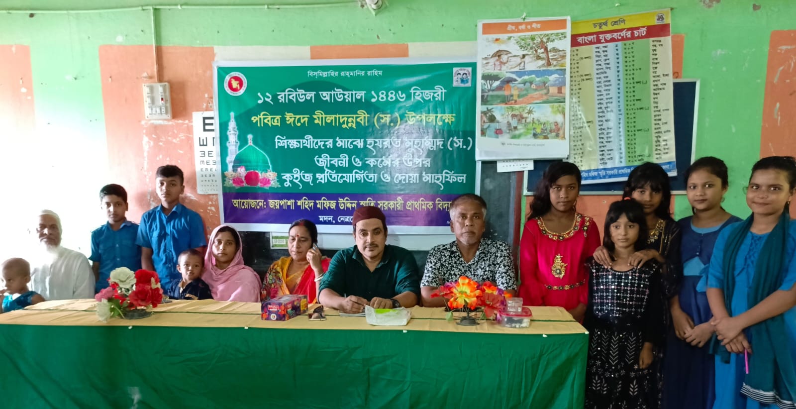 নেত্রকোণা- মদন প্রতিনিধিঃ মদনে ১২ রবিউল আউয়াল ১৪৪৬ হিজরি পবিত্র ঈদে মীলাদুন্নবী( স) উপলক্ষে জয়পাশা শহিদ মফিজ উদ্দিন স্মৃতি সরকারি প্রাথমিক বিদ্যালয়ের শিক্ষার্থীদের মাঝে হযরত মুহাম্মদ ( স)মের জীবনী ও কর্মের উপর কুইজ প্রতিযোগিতা ও দোয়া মাহফিল অনুষ্ঠিত হয়েছে।