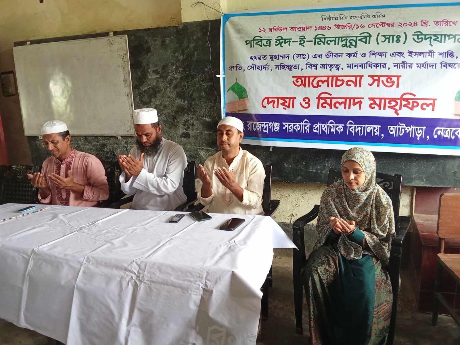 আটপাড়া(নেত্রকোনা) প্রতিনিধি:নানা আয়োজনে নেত্রকোনার আটপাড়ার ৫১ নং রাজেন্দ্রগঞ্জ সরকারি প্রাথমিক বিদ্যালয়ে বিদ্যালয়ে ১২ রবিউল আওয়াল ১৪৪৬ হিজরী পবিত্র ঈদ- ই-মিলাদুন্নবী (সাঃ) উপলক্ষে হযরত মুহাম্মদ (সাঃ) এর জীবন, কর্ম ও শিক্ষা এবং ইসলামি শান্তি, সোহার্দ্য, সহিষ্ণুতা, বিশ্ব ভ্রাতৃত্ব, মানবাধিকার, নারীর মর্যাদা বিষয়ের উপর আলোচনা সভা , দোয়া ও মিলাদ মাহফিল অনুষ্ঠিত হয়েছে। ৷ সোমবার সকালে বিদ্যালয়ের মিলনাতয়নে এ আলোচনা সভা অনুষ্ঠিত হয়৷