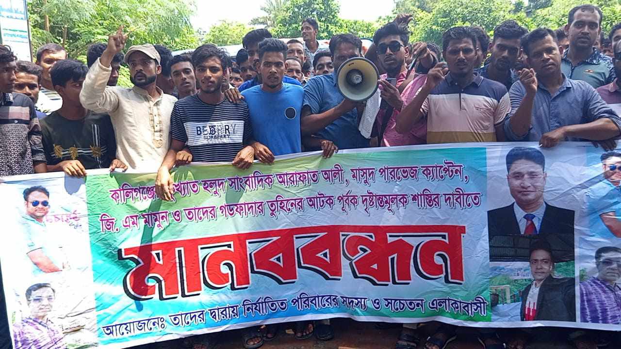 কালিগঞ্জ প্রতিনিধিঃ সাতক্ষীরার কালিগঞ্জে সহস্রাধিক জনতার অংশগ্রহনে তথ্য সন্ত্রাস, ভুমিদস্যু তুহিন, চাঁদাবাজ আরাফাত আলী, মামুন ও পারভেজ গংদের বিরুদ্ধে মানববন্ধন অনুষ্ঠিত হয়েছে। মঙ্গলবার (১৭ সেপ্টেম্বর-২৪) বেলা ১১ টায় কালিগঞ্জ থানার সামনে অনুষ্ঠিত মানববন্ধন বক্তব্যে বক্তারা বলেন- আজকের এই মানববন্ধনের বিষয় হচ্ছে, দীর্ঘ ১৫ বছর আওয়ামী দুরশাষনের সময়ে কালিগঞ্জ উপজেলার ১২ টি ইউনিয়নে হলুদ সাংবাদিকদের দৌরাত্ম্যে অতিষ্ঠ হয়ে উঠেছিল উপজেলা এলাকায় আম ব্যবসায়ী, কাঠ ব্যবসায়ী, বাগদা চিংড়ি ব্যবসায়ী, বালু ব্যবসায়ী, ছোট বড় ব্যবসায়ীসহ আওয়ামী লীগের বাহিরের ভিন্ন রাজনৈতিক দলের নেতাকর্মী ও সমর্থকদের বিরুদ্ধে মিথ্যা মামলা দেওয়া, মামলার ভয় দেখিয়ে লক্ষ লক্ষ টাকা চাঁদাবাজি করা, পুলিশ দিয়ে হয়রানী করানোর নেপথ্যের মুল হোতা ছিলো সাংবাদিক পরিচয়ে অন্যের জমি দখল কারী ভুমিদস্যু পারুলগাছার তুহিন। তার হুকুমে ঐ সকল অপরাধের মুল সহযোগী ছিলো নারীলোভী লম্পট, চাঁদাবাজ মৌতলার আরাফাত আলী, দুদলীর জিএম মামুন ও পানিয়া গ্রামের পারভেজ। তারা এমন ভাবে চাঁদাবাজি করতে করতে কুশুলিয়া গ্রামের বিশিষ্ট হার্ডওয়্যার ব্যবসায়ী উপজেলা স্বেচ্ছাসেবক দলের যুগ্ম আহবায়ক ও কুশুলিয়া ইউনিয়ন স্বেচ্ছাসেবক দলের আহবায়ক কাজী শরিফুল ইসলামকে স্বশরীরে উপস্থিত হয়ে পুলিশ দিয়ে ধরিয়ে দেয়। পুলিশ তার হাতে হ্যান্ডকাপ পরিয়ে শরিফুলের মা বাবা আর পরিবারের সদস্যদের নিকট ছিনিয়ে ঘর থেকে গলাধাক্কা দিয়ে বের করে। পুলিশের পাশাপাশি এই আরাফাত, মামুন ও পারভেজ নিজেই নানান অকথ্য ভাষায় গালিগালাজ করতে করতে প্রকাশ্যে দু’লক্ষ টাকা চাঁদা দাবী করে। একপর্যায়ে সন্তানের কথা চিন্তা করে শরিফুলের বাবা কাজী নবিদুল ইসলাম নবু আরাফাত গংদের সাথে মধ্যস্ততায় শেষমেষ ১ লক্ষ ২০ হাজার টাকা নেয়। এরপরে থানায় নিয়ে কাওকে না জানানোর শর্তে ছেড়ে দেয়। এখানে খ্যান্ত হয়নি তুহিনসহ আরাফাত গং। নানান হুমকি ধমকী দিয়ে আসছিলো বিগত দিনে। ইতিমধ্যে গত ৫ ই আগস্ট ২০২৪ তারিখে ছাত্র জনতা আর বিএনপি সহ অনন্য ফ্যাসিবাদ বিরোধী মনা অনন্য রাজনৈতিক দলের সরব আন্দোলনে দেশ দ্বিতীয় বারের মত স্বাধীনতা লাভ করে। একারণে ব্যাপক হয়রানি আর ব্যাপক ক্ষতিগ্রস্ত কাজী শরিফুল ইসলাম গত বুধবারে অতি ধুরন্ধর হলুদ সাংবাদিক আরাফাত আলীকে কুশুলিয়া হাটখোলায় পেয়ে তার হাতে দেওয়া ১ লক্ষ ২০ হাজার টাকা ফেরত চায়। এসময়ে সে বলে টাকা তো পুলিশকে দিয়েছিলাম, এতোদিন পরে এব্যারে আমি কিছু বলতে করতে পারবো না। এসময়ে শরিফুল কুলাঙ্গার আরাফাত কে একসপ্তাহ সময় দেয় টাকাটা ফেরত দেওয়ার জন্য। এরপরে ক্ষিপ্ত হয়ে তুহিনের নেতৃত্বে আরাফাত মামুন গং শর