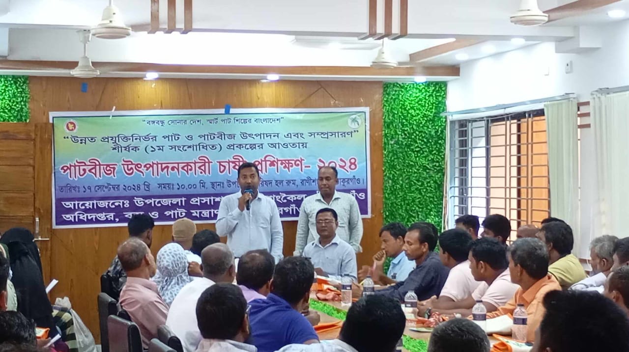 ঠাকুরগাঁও জেলার রাণীশংকৈল উপজেলায় দিনব্যাপী পাটবীজ উৎপাদনকারী চাষীদের প্রশিক্ষণ কর্মশালা অনুষ্ঠিত হয়েছে। পাট অধিদপ্তরের উদ্যোগে ১৭ সেপ্টেম্বর মঙ্গলবার সকালে উন্নত প্রযুক্তিনির্ভর পাট ও পাটবীজ উৎপাদন এবং সম্প্রসারণ প্রকল্পের আওতায় চাষিদের মাঝে এই প্রশিক্ষণ দেওয়া হয়। প্রশিক্ষণ কর্মসূচিতে চাষীদের পাটচাষ ও বীজ উৎপাদন সংশ্লিষ্ট বিষয়ে সচেতনতা ও দক্ষতা বৃদ্ধির লক্ষ্যে বিভিন্ন টেকনিক্যাল বিষয়ে আলোচনা হয়। রানীশংকৈল উপজেলা নির্বাহী কর্মকর্তা (ইউএনও) রকিবুল হাসানের সভাপতিত্বে এবং ঠাকুরগাঁও জেলা পাট উন্নয়ন কর্মকর্তা অসিম কুমার মালাকার এর