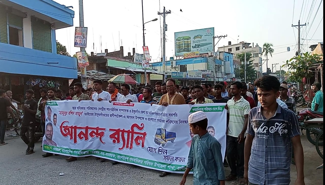 ঠাকুরগাঁয়ের রাণীশংকৈল উপজেলায় ২১শে সেপ্টেম্বর বিকেল ৩টার সময় আবাদ তাকিয়া মোহাম্মদিয়া কামিল মাদ্রাসার সামনে থেকে রাণীশংকৈল উপজেলার গণ অধিকার পরিষদের সমন্বয়ক সোহরাব, সহ সমন্বয়ক জাফর আলীর উদ্যোগে এক বর্ণাঢ্য আনন্দ শোভাযাত্রা অনুষ্ঠিত হয়।