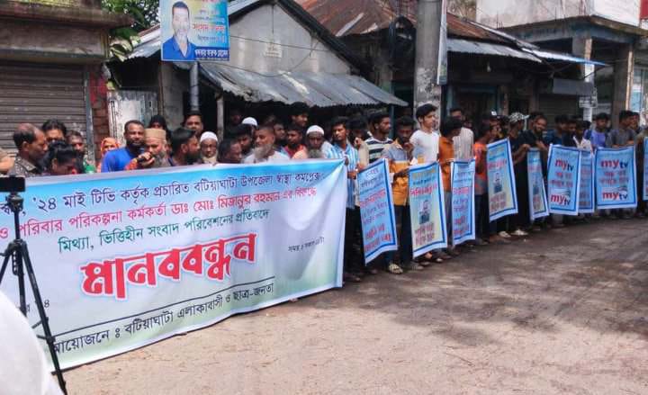 বটিয়াঘাটা উপজেলা স্বাস্থ্য কমপ্লেক্সের স্বাস্থ্য ও পরিবার পরিকল্পনা কর্মকর্তা ডাঃ মোঃ মিজানুর রহমানের বিরুদ্ধে গত ১৪/০৯/২৪ তারিখ মাই টিভিতে তাকে নিয়ে অনিয়ম দুর্নীতি শিরোনাম একটি সংবাদ পরিবেশন করেন যার সাথে বাস্তবতার কোন মিল নাই, উক্ত মিথ্যা সংবাদের বিরুদ্ধে গতকাল শনিবার সকাল ১১ টার সময় বটিয়াঘাটা থানার মোড় চত্বরেএক মানববন্ধন অনুষ্ঠিত হয়। অনুষ্ঠান পরিচালনা করেন মোঃ ইমরান হোসেন ।মানব বন্ধনে বক্তব্য রাখেন বটিয়াঘাটার ছাত্র সমান্যায়কদের মধ্যে তানভীর আলম,শেখ রাসেল হোসেন উক্ত স্বাস্থ্য কমপ্লেক্সে সেবা প্রার্থী মোহাম্মদ চান মিয়া সাদিয়া ইসলাম, রিপন, মিকাইল হোসেন।,ছাত্রনেতা বলেনএই মাই টিভির সাংবাদিক শিশির রঞ্জন মল্লিক, খুলনা থেকে এসে আমাদের বটিয়াঘাটাতে বিভিন্ন সময় জমি দখল চাঁদাবাজির সাথে লিপ্ত রয়েছে। সে ডাক্তার মোঃ মিজানুর রহমানের কাছে চাঁদা দাবি করে তাকে চাঁদা দিতে অস্বীকৃতি জানানই তার বিরুদ্ধে এই মিথ্যা সংবাদ মাই টিভিতে সম্প্রচার করা হয়েছে। আমরা তার তীব্র নিন্দা জানাই ও তাকে মাই টিভি থেকে বহিষ্কারের জোর দাবি জানাই।, সেবা প্রার্থী, মিকাইল হোসেন বলেন, সে আমার দুটি সন্তানকে খুব যত্ন সহকারে এখানে সেবা দিয়ে সুস্থ করে তুলেছে করোনা কালীন সময়ে আমার মা-বাবাকে তিনি নিজে এসে চিকিৎসা দিয়েছেন। উক্ত হাসপাতালের রোগী সাদিয়া বলেন আমি দীর্ঘদিন এই হাসপাতালের ভর্তি আছি আমি কখন ও দেখি নাই কোন হাসপাতালের প্রধান এভাবেই রোগীর কাছে এসে সেবা প্রদান করেন। উক্ত সংবাদের প্রেক্ষিতে বিভাগীয় স্বাস্থ্য পরিচালকের মাধ্যমে যে তদন্ত কমিটি গঠন করা হয়েছে আমরা সেই তদন্ত কমিটিকে জানাতে চাই যে যারা এই ধরনের মিথ্যা সংবাদ পরিবেশন করেছে তাদের বিরুদ্ধে আপনারা পদক্ষেপ নেন।