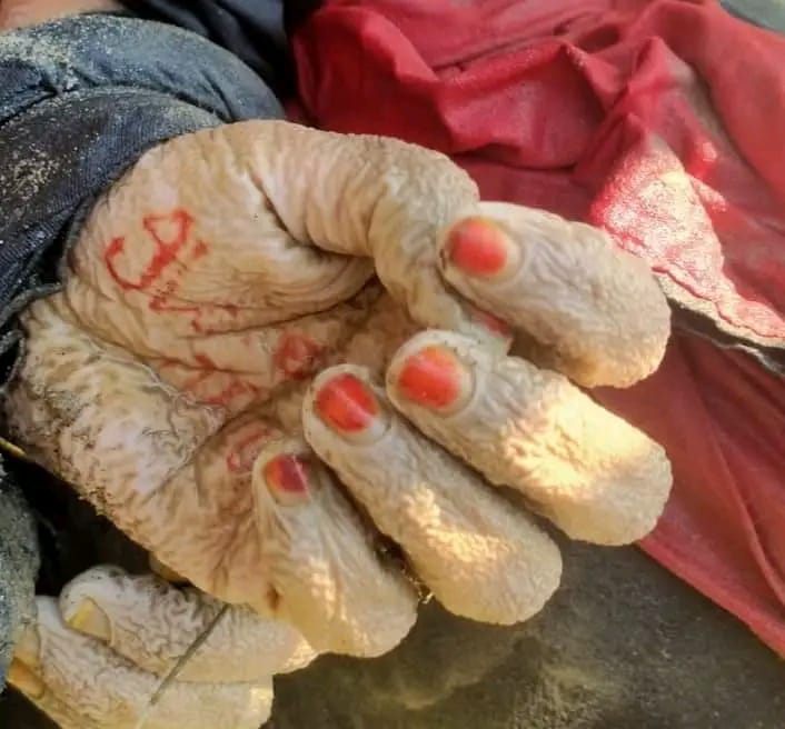 বয়স অনুমানিক ২০ থেকে ৩০, কালো রঙ্গের জামা/পায়জামা পরিহিত, , হাতে মেহেদী, গলায় সিলভার রঙ্গের মালা রয়েছে।