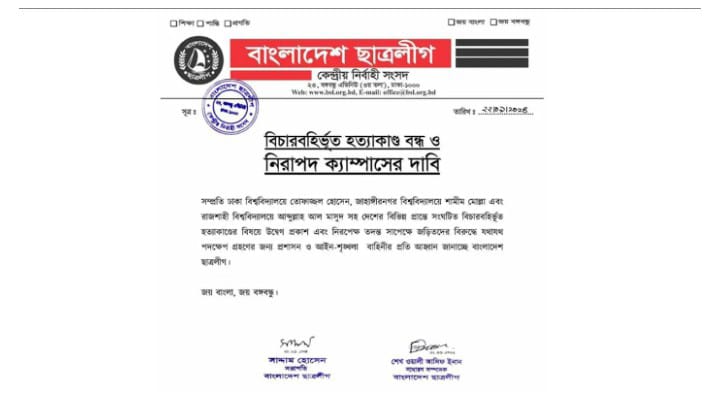 আজ ২২ সেপ্টেম্বর রবিবার ছাত্রলীগের কেন্দ্রীয় সভাপতি সাদ্দাম হোসেন ও সাধারণ সম্পাদক শেখ ওয়ালী আসিফ ইনান সই করা প্রেস বিজ্ঞপ্তিতে সম্প্রতি ঢাকা বিশ্ববিদ্যালয়ে তোফাজ্জল হোসেন, জাহাঙ্গীরনগর বিশ্ববিদ্যালয়ে শামীম মোল্লা এবং রাজশাহী বিশ্ববিদ্যালয়ে আব্দুল্লাহ আল মাসুদসহ দেশের বিভিন্ন প্রান্তে সংঘটিত বিচারবহির্ভূত হত্যাকাণ্ডের বিষয়ে উদ্বেগ প্রকাশ করেছে ছাত্রলীগ।