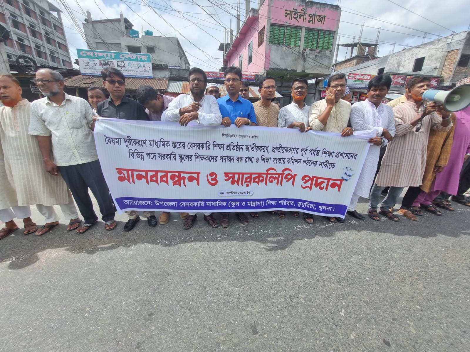 উপজেলা বেসরকারি মাধ্যমিক (স্কুল ও মাদ্রাসা) শিক্ষা পরিবার, ডুমুরিয়া, খুলনার আয়োজনে বৈষম্য দূরীকরণে মাধ্যমিক স্তরের বেসরকারি শিক্ষা প্রতিষ্ঠান জাতীয়করণ, জাতীয়করণের পূর্ব পর্যন্ত শিক্ষা প্রশাসনের বিভিন্ন পদে সরকারি স্কুলের শিক্ষকদের পদায়ন বন্ধ রাখা ও শিক্ষা সংস্কার কমিশন গঠনের দাবীতে মানববন্ধন ও স্মারকলিপি প্রদান
