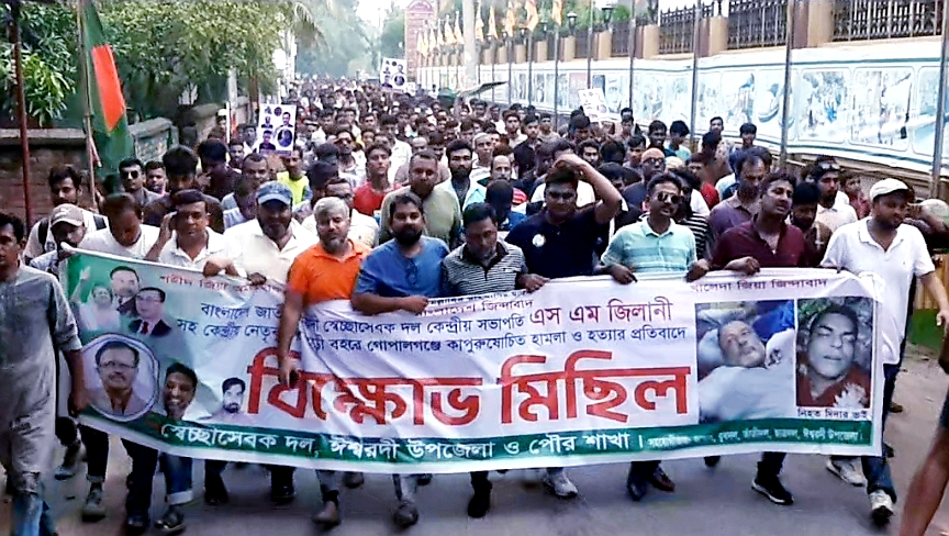 গোপালগঞ্জে বাংলাদেশ জাতীয়তাবাদী স্বেচ্ছাসেবক দলের কেন্দ্রীয় সভাপতি এস এম জিলানী সহ কেন্দ্রীয় নেতৃবৃন্দের গাড়িবহরে হামলা ও হত্যার প্রতিবাদে পাবনার ঈশ্বরদীতে বিক্ষোভ মিছিল অনুষ্ঠিত হয়েছে।
