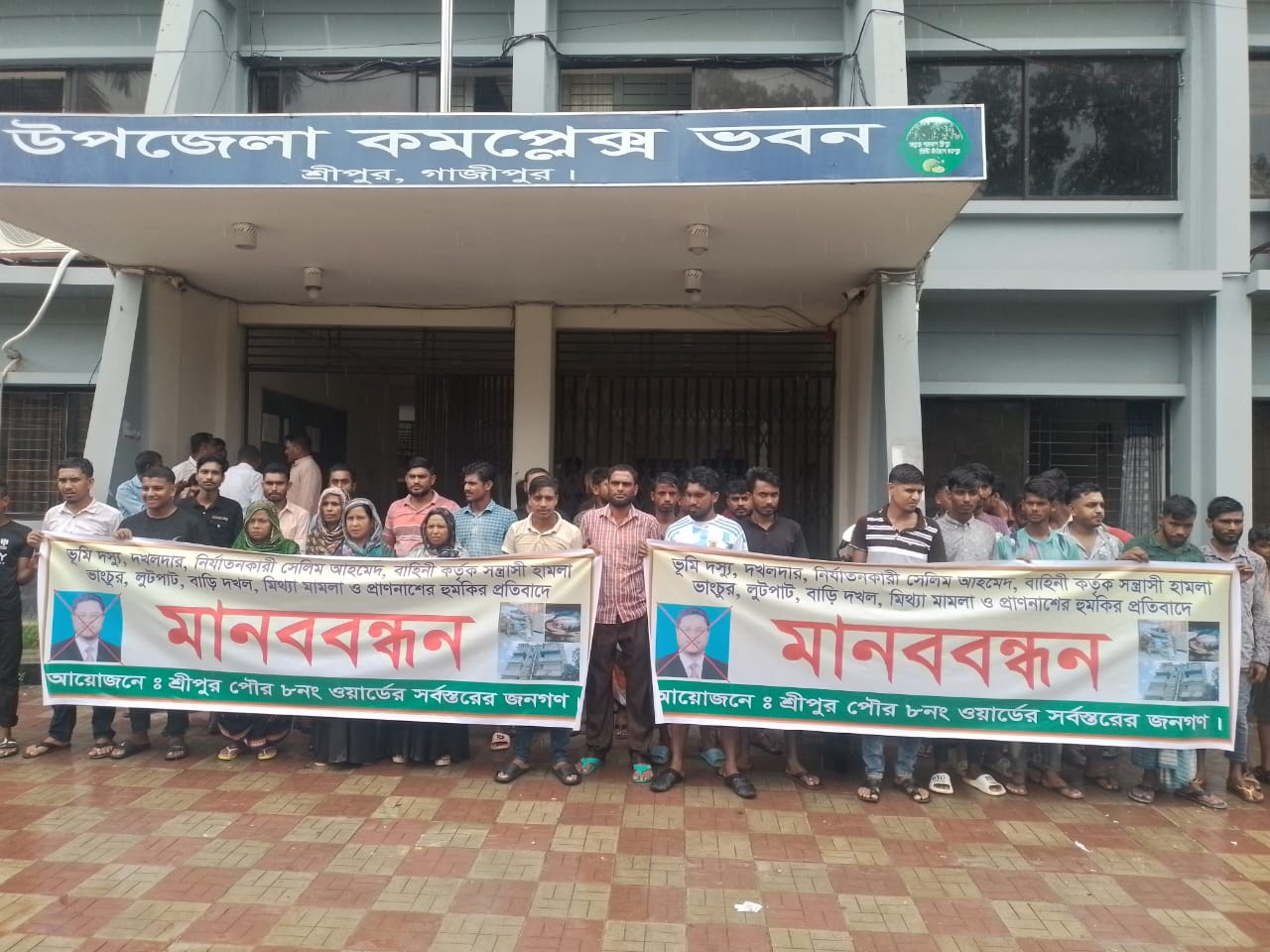 মানববন্ধনে ভুক্তভোগীরা বলেন, সেলিম আহমেদ শ্রীপুর পৌর যুবদলের সিনিয়র যুগ্ম আহবায়ক। তিনি ওই পদের পেশিশক্তি খাটিয়ে বিভিন্নভাবে এলাকার মানুষকে অত্যাচার, নির্যাতন ও হয়রানি করে আসছে। তাদের লাঠিয়াল বাহিনী নিয়ে যে কাওকে মারধর করে, মিথ্যা মামলায় ফাসিয়ে ব্ল্যাকমেইল করা ও হত্যার হুমকি সহ নানা ভাবে মানুষকে অত্যাচার করে আসছে।
