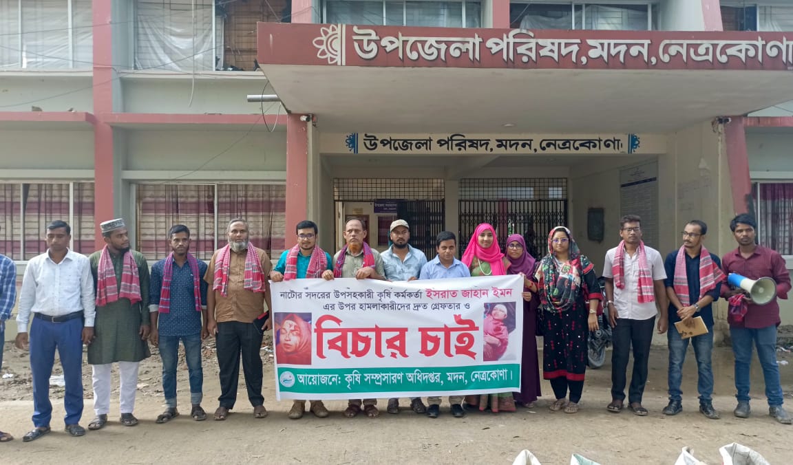 মদন উপজেলা পরিষদের সামনে আজ সকালে এক প্রতিবাদ ও দ্রুত গ্রেফতার এবং বিচারে দাবীতে প্রতিবাদ সমাবেশ করেন উপজেলা কৃষি অফিস।