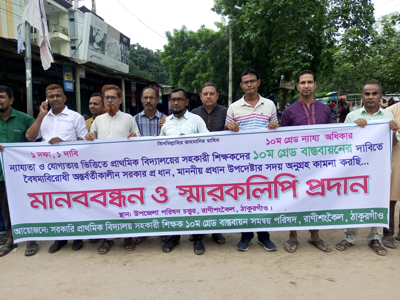 রাণীশংকৈলে প্রাথমিক সহকারী শিক্ষকদের ১০ম গ্রেড বাস্তবায়নে দাবিতে মানববন্ধন ও স্মারকলিপি প্রদান