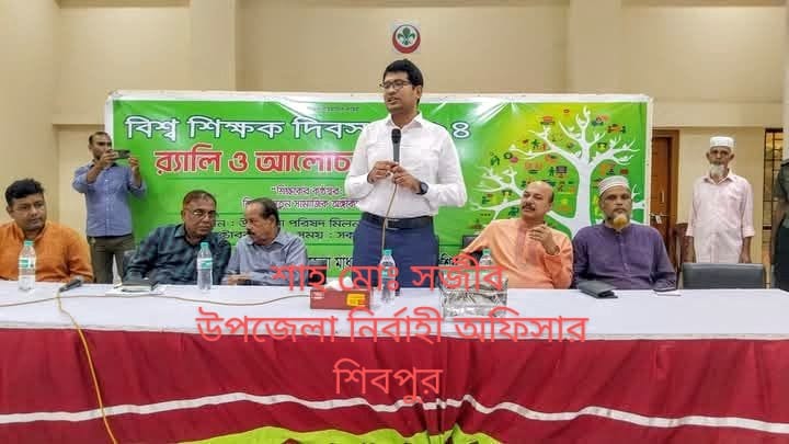 নরসিংদীর শিবপুর উপজেলায় বিশ্ব শিক্ষক দিবস উদযাপন উপলক্ষে শিবপুর উপজেলা প্রশাসন ও উপজেলা মাধ্যমিক শিক্ষা অফিসের আয়োজনে আলোচনা সভা ও ৱ্যালি অনুষ্ঠিত হয়েছে। অদ্য ৫ অক্টোবর ২০২৪ ইং শনিবার সকালে শিবপুর উপজেলা পরিষদ মিলনায়তনে এ সভা অনুষ্ঠিত হয়। সভায় সভাপতিত্ব করেন শিবপুর উপজেলা নির্বাহী অফিসার শাহ মোঃ সজীব। বক্তব্য রাখেন নরসিংদী জেলা বিএনপির সিনিয়র যুগ্ম আহবায়ক আলহাজ্ব তোফাজ্জল হোসেন মাষ্টার, শিবপুর উপজেলা বিএনপির সভাপতি আবুল হারিস রিকাবদার কালা মিয়া, উপজেলা মাধ্যমিক শিক্ষা অফিসার মোঃ আলতাফ হোসেন, শিবপুর উপজেলা জামায়াতে ইসলামীর আমীর মোঃ মোস্তাফিজুর রহমান কাওসার, শিবপুর সরকারি পাইলট মডেল উচ্চ বিদ্যালয়ের প্রধান শিক্ষক নূর উদ্দিন মোঃ আলমগীর,