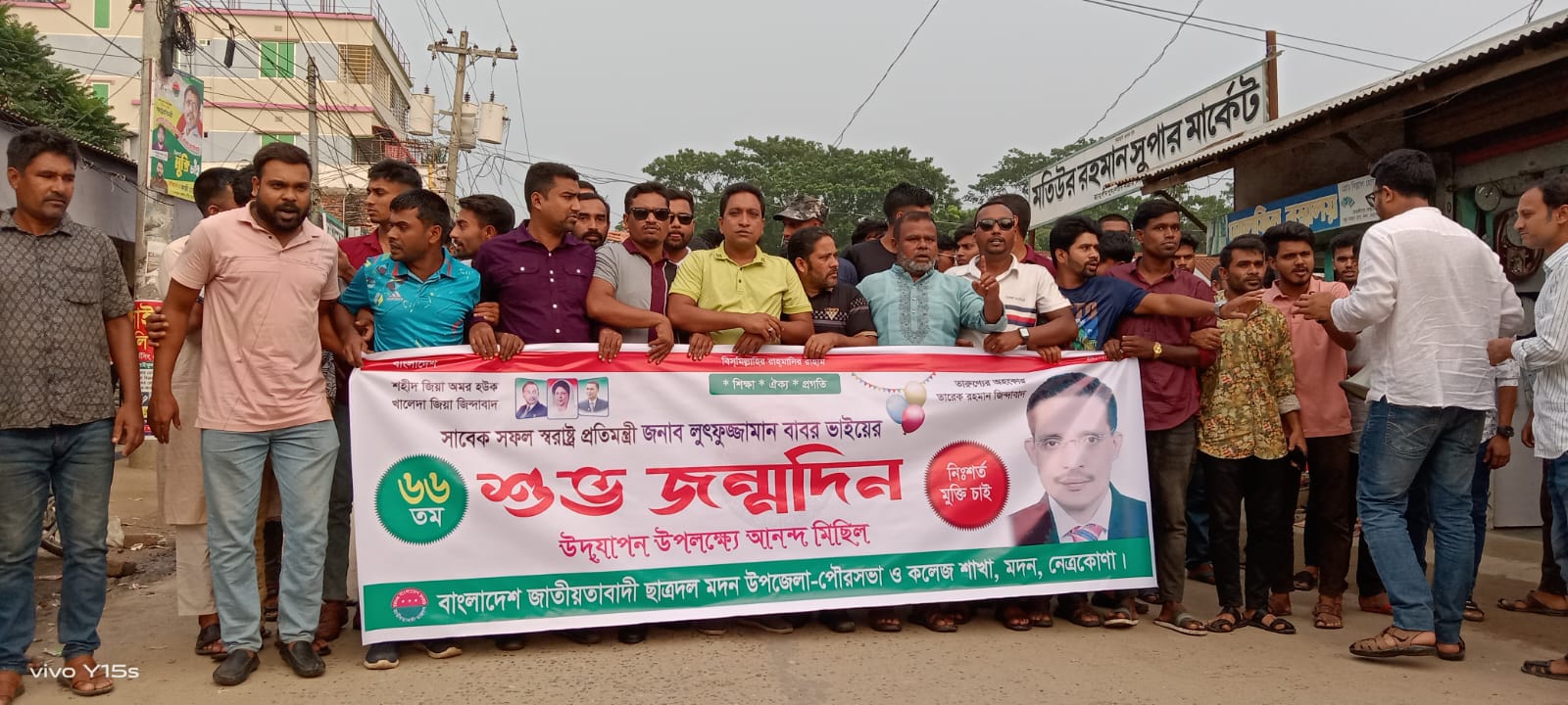 আনন্দ মিছিল করেছে উপজেলা ছাত্রদল।আনন্দ মিছিল টি উপজেলার বিএনপির দলীয় কার্যালয় থেকে বেড় হয়ে মদন পৌর সদরের প্রধান প্রধান সড়ক প্রদর্শন করে, সরকারি হাজী আব্দুল আজিজ খান ডিগ্রি কলেজ মাঠে শেষ হয়।পরে পৌর ছাত্রদলের আহ্বায়ক মোঃ মাহমুদ রহমান মিটু সঞ্চালনায় উপজেলা ছাত্র দলের সভাপতি এস এইচ পিপুল এর সভাপতিত্বে এক আলোচনা সভা অনুষ্ঠিত হয়।