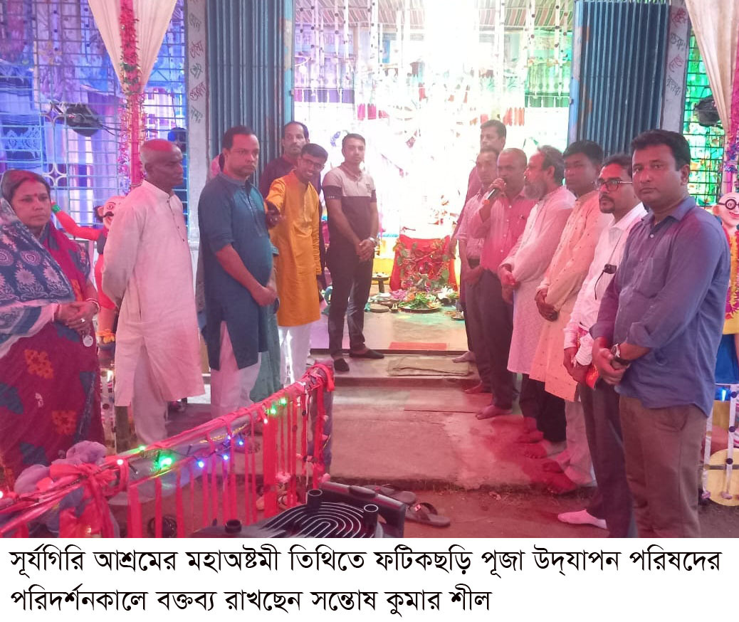 হাইদচকিয়া সার্বজনীন শ্রী শ্রী দুর্গা মাতৃমন্দির ও নবগ্রহ মন্দির প্রাঙ্গণে সূর্যগিরি আশ্রমে সার্বজনীন দুর্গাপূজা উদযাপন পরিষদের উদ্যোগে মহাঅষ্টমী তিথিতে শিক্ষাসামগ্রী বিতরণ অনুষ্ঠান ফটিকছড়ি পূজা উদ্যাপন পরিষদ আহ্বায়ক কমিটি পরিদর্শন করে। সংগঠনের সভাপতি বিপ্লব চৌধুরী কাঞ্চনের সভাপতিত্বে অনুষ্ঠানে স্বাগত বক্তব্য রাখেন অর্চনা রানী আচার্য। এ সময় আরও বক্তব্য রাখেন রূপনা আচার্য, দীপন ভট্টাচার্য, টিটু চৌধুরী, ধীমান দাশ ও সমীর কান্তি দাশ। এ সময় উপস্থিত ছিলেন মহানগর পূজা উদ্যাপন পরিষদের প্রেসিডিয়াম সদস্য ডা. বিজয়কৃষ্ণ বৈষ্ণব, ফটিকছড়ি পূজা উদ্যাপন পরিষদের সাবেক সভাপতি মাস্টার রতন কান্তি চৌধুরী, আহ্বায়ক সন্তোষ কুমার শীল, কাজল শীল, সুজিত চক্রবর্তী, সত্যজিৎ খাস্তগীর, বিপ্লব খাস্তগীর, পিন্টু শীল, রূপম ভৌমিক, বাসু ঘোষ, পলাশ নাথ, তাপস চক্রবর্তী, মিলন দাশ। এ সময় গীতা ও চণ্ডীপাঠ প্রতিযোগিতায় প্রায় ৮০ ছাত্রছাত্রীকে পুরস্কার বিতরণ করা হয়।