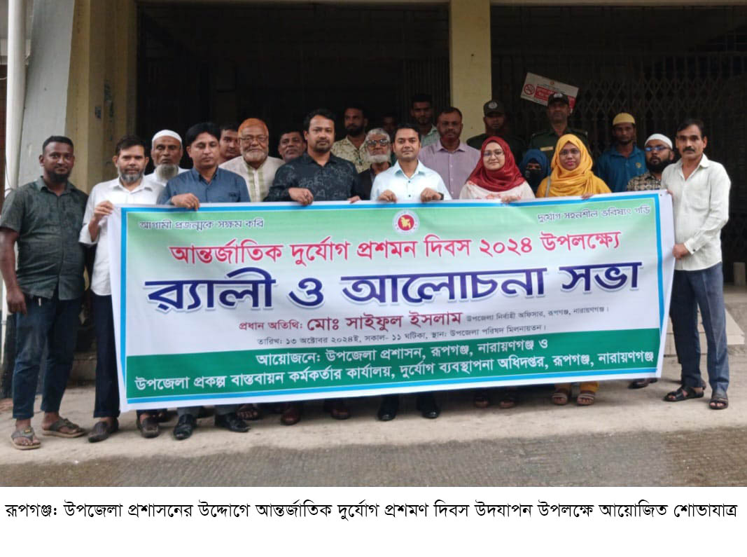নারায়ণগঞ্জের রূপগঞ্জ উপজেলা প্রশাসনের উদ্যেগে আন্তর্জাতিক দুর্যোগ প্রশমণ দিবস উদযাপন উপলক্ষে শোভাযাত্রা ও আলোচনা সভা অনুষ্ঠিত হয়েছে। গতকাল ১৩অক্টোবর রবিবার রূপগঞ্জ উপজেলা মিলনায়তনে আয়োজিত সভায় সভাপতিত্ব করেন রূপগঞ্জ উপজেলা নির্বাহী অফিসার মোঃ সাইফুল ইসলাম। সভায় বক্তব্য রাখেন উপজেলা প্রকল্প বাস্তবায়ন কর্মকর্তা মোঃ আরিফুল হাসান প্রমুখ