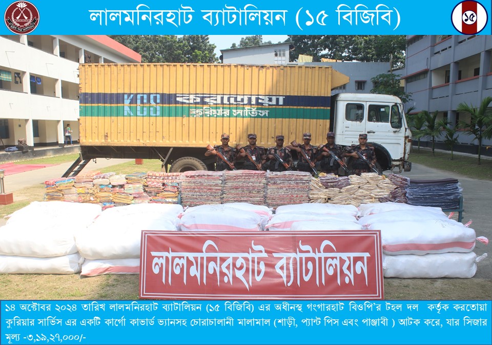 মালামাল বহন করে ঢাকায় গমন করবে। উক্ত সংবাদের ভিত্তিতে অধিনায়কের নির্দেশক্রমে গংগারহাট বিওপি হতে একটি বিশেষ টহল দল লালমনিরহাট বড়বাড়ী এলাকায় রাস্তার পার্শ্বে ওঁৎ পেতে থাকে। আনুমানিক ৯,১৫ ঘটিকায় উক্ত কাভার্ড ভ্যানটি আসতে দেখে টহল দল গাড়ীটিকে থামার নির্দেশ দিলে গাড়ীটি না থামায় টহল দল গাড়ীটির পিছু ধাওয়া করতে থাকে। পরবর্তীতে গাড়ীটি অদ্য ১৩ অক্টোবর ২০২৪ তারিখ আনুমানিক ১২টা ৪৫ ঘটিকায় তিস্তা টোল প্লাজায় পৌছায় তখন টহল দল উক্ত গাড়ীটি আটক করতে সক্ষম হয় এবং গাড়ীটি তল্লাশী করে গাড়ীর ভিতরে ভারতীয় অবৈধ চোরাচালানী মালামাল পাওয়া যায়। পরবর্তীতে উক্ত কাভার্ড ভ্যান ব্যাটালিয়ন সদরে আনয়ন করতঃ কাভার্ড ভ্যানের মধ্য হতে নিম্নবর্ণিত ভারতীয় অবৈধ চোরাচালানী মালামাল উদ্ধার করে বিজিবি।আটককৃত মালামাল গুলো হচ্ছে