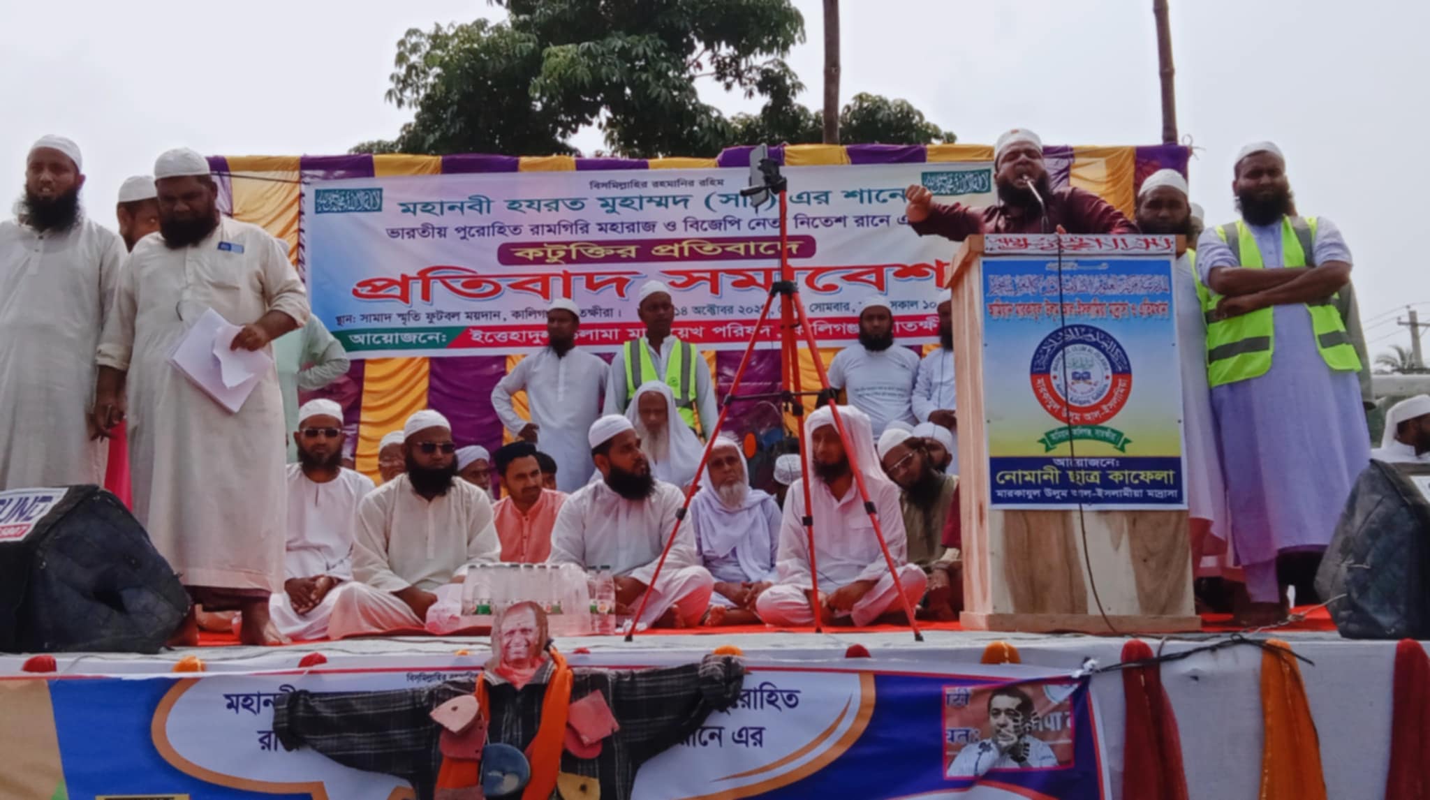 মহানবী হযরত মুহাম্মদ (সা:) এর নামে কটুক্তির প্রতিবাদে কালিগঞ্জে বিশাল প্রতিবাদ সমাবেশ অনুষ্ঠিত হয়েছে। সর্বকালের সর্বশ্রেষ্ঠ মানব, বিশ্ব মুসলিম জাহানের মহামানব আমাদের প্রাণপ্রিয় মহানবী হযরত মুহাম্মদ (সা:) এর নামে ভারতীয় পুরোহিত রামগিরি মহারাজ ও বিজেপি নেতা নিতেশ রানে এর কটুক্তির প্রতিবাদে সোমবার (১৪ অক্টোবর ) সকাল ১০টায় উপজেলার বাস টার্মিনাল সংলগ্ন শহীদ সামাদ স্মৃতি ফুটবল মাঠে উপজেলা শাখার ইত্তেহাদুল ওলামা মাশায়েখ পরিষদের সার্বিক আয়োজনে বাজার গ্রাম রহিমপুর ঐতিহ্যবাহী জামিয়া ইমদাদিয়া তালিমুল কুরআন মাদ্রাসার প্রতিষ্ঠাতা ও ইমাম পীরে কামেল হযরত মাওঃ আলহাজ্ব অজিহুর রহমানের সভাপতিত্বে অনুষ্ঠিত প্রতিবাদ সমাবেশে এ সময় উপস্থিত থেকে বক্তব্য রাখেন মাওঃ মুফতি জিয়াউর রহমান, মাওঃ নুরুল ইসলাম, মাওঃ আমিনুর রহমান, মাওঃ আব্দুল গফুর, মাওঃ আব্দুর রউফ, মাওঃ আবু হাসান, মাওঃ হেলাল বিন শামসুর, মাওঃ হাফিজুর রহমান, মাওঃ তারিকুল ইসলাম, হাফেজ এমদাদ হোসেন, মাওঃ আরিফ বিল্লাহ, মাওঃ সাইদুল ইসলাম, হাফেজ আতিয়ার রহমান, মাওঃ আলমগীর হোসেন, মাওঃ আইনুল ইসলাম, হাফেজ গোলাম মোস্তফা, হাফেজ হাবিবুল্লাহ বাহার, মাওঃ সাইফুল্লাহ সিদ্দিকী, মাওঃ খাইরুল বাশার, মাওঃ আশরাফুল ইসলাম আজিজী, মাওঃ আতাউল্লাহ, হাফেজ জামিনুর রহমান, হাফেজ আকরাম হোসেন, হাফেজ আবু হাসান মেজবাহ, মাওঃ আজিজ, মাওঃ আনসার উদ্দিন, হাফেজ আব্দুল লতিফ, মাওঃ আব্দুল আলিম, মাওঃ আবুল খায়ের, আব্দুল গফুর, মাওঃ আব্দুল্লাহ, মাওঃ রবিউল ইসলাম, মাওঃ আল আমিন, জামাতের পক্ষ থেকে ছাত্রশিবিরের সাবেক সভাপতি ও প্রত্যায় গ্রুপের চেয়ারম্যান সিরাজুল ইসলাম, মাওলানা মঞ্জুরুল ইসলাম, উপজেলা জাতীয়তাবাদী ওলামা দলের সভাপতি হাফেজ আব্দুল মজিদ প্রমূখ। সমাবেশে বক্তারা বলেন ভারতের মহারাষ্ট্রের হিন্দু পুরোহিত রামগিরি মহারাজ এবং তাকে সমর্থনকারী বিজেপির সংসদ সদস্য নিতেশ নারায়ণের বিরুদ্ধে মামলায় গ্রেফতার হলেও তার ফাঁসি দাবি করেন। অন্যথায় আমরা ভারতীয় পণ্য বয়কট, লং মার্চ করাসহ ভারতীয় হাই কমিশনার অফিস ঘেরাও করার কর্মসূচি দেওয়ার হুমকি দেওয়া হয়। এ সময় উপস্থিতি বক্তারা ইসলাম অবমাননা কারীদের শাস্তি দাবী করেন। বক্তারা আরো বলেন অন্তবর্তী কালীন সরকারের প্রধান উপদেষ্টা ডাঃ ইউনুস সহ অন্যান্য উপদেষ্টাদের উদ্দেশ্যে বলেন আমরা বাংলাদেশকে স্বাধীন করে আপনাদের হাতে সংস্কারের দায়িত্ব দিয়েছি আপনি সহ আপনার উপদেষ্টা পরিষদ নিয়ে ভারতীয় হাই কমিশনারকে ডেকে এর প্রতিবাদ জানান। তা না হলে আমরা কঠোর কর্মসূচি দিতে বাধ্য হবো আমরা সর্বস্তরের মুসলিম জাতি। উক্ত প্রতিবাদ সমাবেশের আগ মুহূর্তে উপজেলার বিভিন্ন সড়ক মহাসড়কের সামনে থেকে মিছিলটি শুরু হয়।
