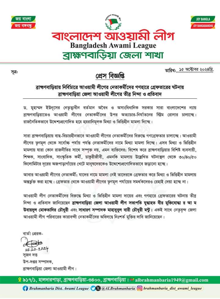 ড. মুহাম্মদ ইউনূসের নেতৃত্বাধীন বর্তমান অবৈধ ও অসাংবিধানিক সরকার সারা বাংলাদেশের ন্যায় ব্রাহ্মণবাড়িয়াতেও আওয়ামী লীগের নেতাকর্মীদের উপর অত্যাচার-নির্যাতনের স্টিম রোলার চালাচ্ছে। রাজনৈতিকভাবে উদ্দেশ্যপ্রণোদিত হয়ে হয়রানিমূলক মিথ্যা ও ভিত্তিহীন মামলা দিচ্ছে।