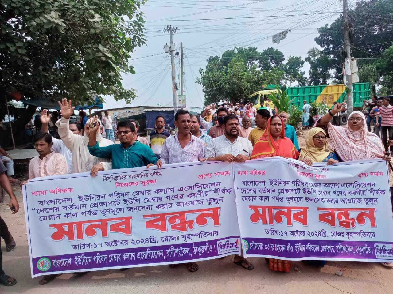 ঠাকুরগাঁও জেলার রানীশংকৈল উপজেলার ইউনিয়ন পরিষদের সদস্য ও সংরক্ষিত মহিলা সদস্যদের অপসারণ না করার দাবিতে ও পুর্ণ মেয়াদকাল পর্যন্ত রাখতে মানববন্ধন, বিক্ষোভ ও প্রধান উপদেষ্টা বরাবর স্মারকলিপি প্রদান করেছে ইউপি সদস্যরা। ১৭ অক্টোবর বৃহস্পতিবার বেলা ১১টায় পৌর শহরের বিক্ষোভ মিছিল শেষে রানীশংকৈল উপজেলা পরিষদের সামনে সড়কের পাশে দাঁড়িয়ে রানীশংকৈল উপজেলার ৮টি ইউনিয়নের ইউপি সদস্য ও সংরক্ষিত মহিলা সদস্যরা ঘণ্টাব্যাপী এই মানববন্ধন করেন।