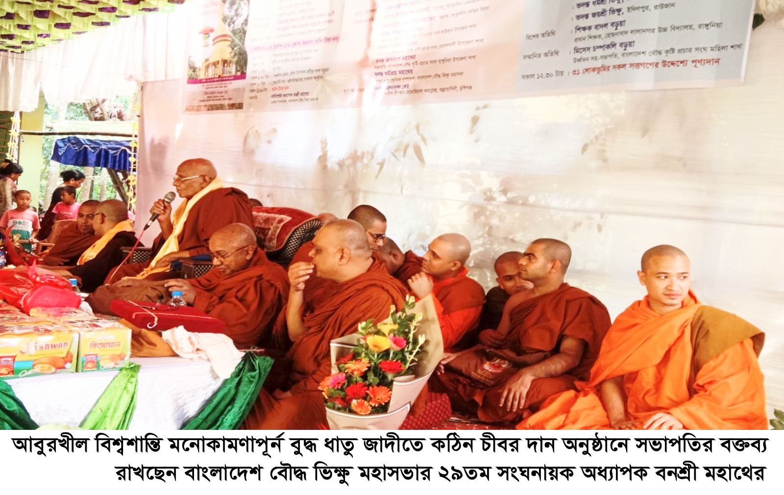 বাংলাদেশী বৌদ্ধদের প্রাচীনতম ধর্মীয় সংগঠন বাংলাদেশ বৌদ্ধ ভিক্ষু মহাসভার ২৯তম সংঘনায়ক পন্ডিত অধ্যাপক বনশ্রী মহাথেরর সভাপতিত্বে প্রধান অতিথি হিসেবে উপস্থিত ছিলেন দানশীল ব্যাক্তিত্ব প্রকৌশলী বিদুৎ বড়ুয়া মুন্না এবং উদ্বোধন করেন দানশীল ব্যাক্তিত্ব শিবু প্রসাদ বড়ুয়া ।