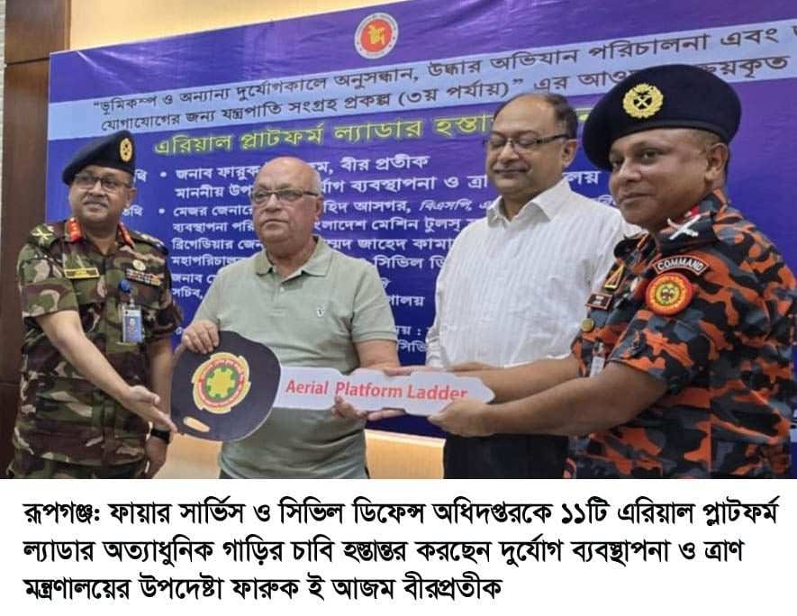 পরে দুর্যোগ ব্যবস্থাপনায় ভূমিকম্প ও অন্যান্য দুর্যোগে অনুসন্ধান উদ্ধার অভিযানের জন্য ফায়ার সার্ভিস ও সিভিল ডিফেন্স অধিদপ্তরকে ১১টি এরিয়াল প্লাটফর্ম ল্যাডার অত্যাধুনিক গাড়ির চাবি হস্তান্তর করা হয়।