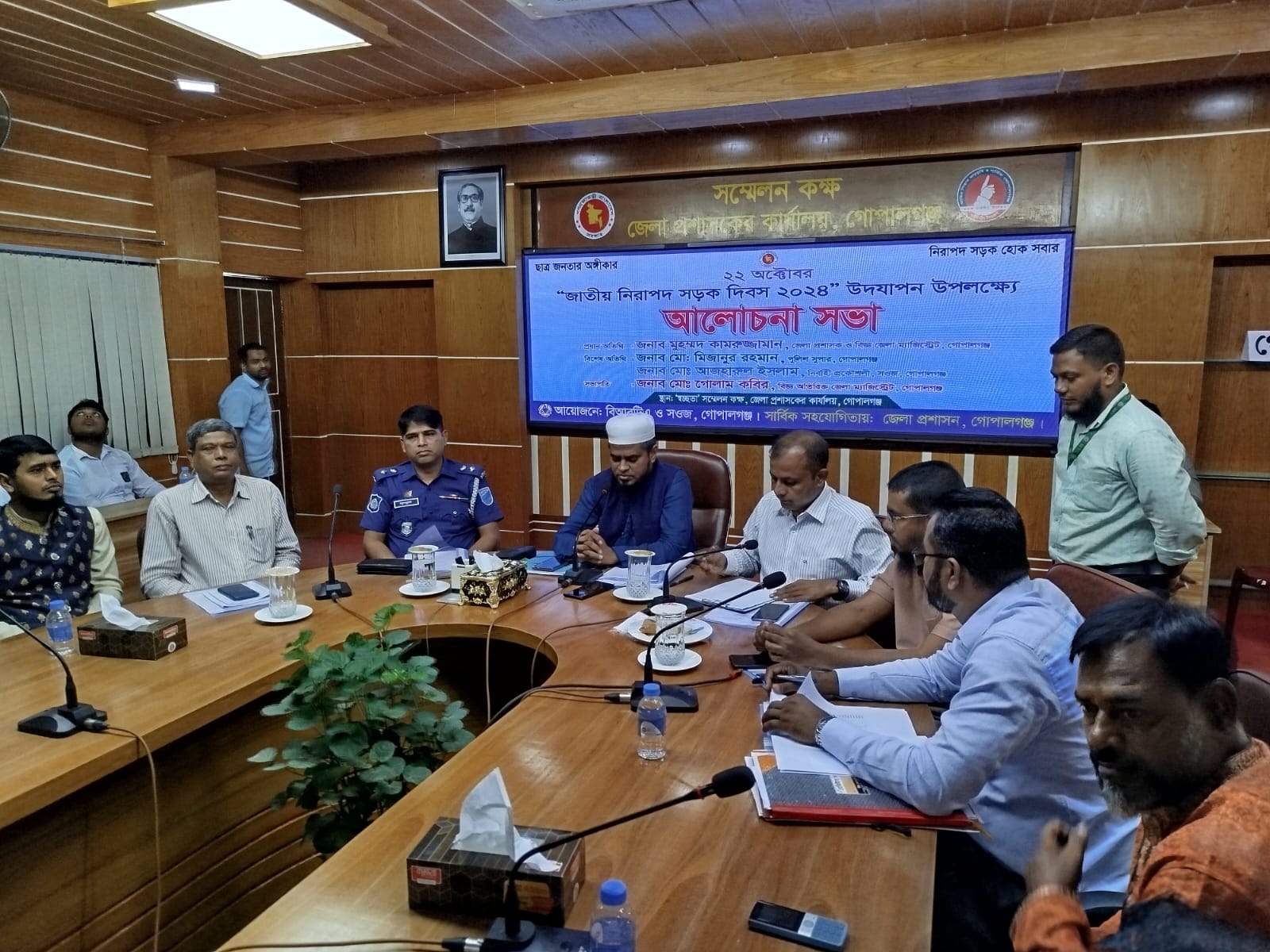 “ছাত্র জনতার অঙ্গীকার নিরাপদ সড়ক হোক সবার” এই স্লোগানকে সামনে রেখে সারা দেশের ন্যায় গোপালগঞ্জ জেলা প্রশাসকের কার্যালয়ের সম্মেলন কক্ষে জাতীয় নিরাপদ সড়ক দিবস ২০২৪ উদ্যাপন উপলক্ষে আলোচনা সভা অনুষ্ঠিত হয়। বিজ্ঞ অতিরিক্ত জেলা ম্যাজিস্ট্রেট মো. গোলাম কবিরের সভাপতিত্বে আলোচনা সভায় প্রধান অতিথি হিসাবে উপস্থিত ছিলেন জেলা প্রশাসক ও বিজ্ঞ জেলা ম্যাজিস্ট্রেট মোহাম্মাদ কামরুজ্জামান।
