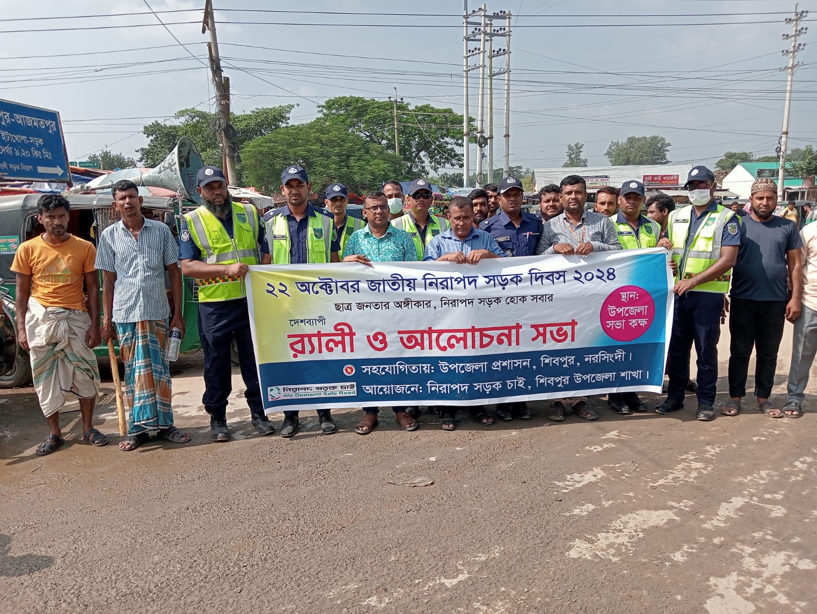 মোঃ কামাল হোসেন প্রধান জেলা প্রতিনিধি নরসিংদী ঃ নরসিংদীর শিবপুরে প্রসাশনের সহযোগিতায় ২২অক্টবর মঙ্গলবার জাতীয় নিরাপদ সড়ক চাই ২০২৪ ইং দিবসটি পালিত হয়েছে । অদ্য ২২/১০/২০২০ইং রোজ মঙ্গলবার সকালে সভাপতি আব্দুল হান্নান মানিক জাতীয় নিরাপদ সড়ক চাই শিবপুর উপজেলা শাখার এর সভাপতিত্বে সকালে রেলী শেষে উপজেলা পরিষদ সম্মেলন কক্ষে আলোচনা সভা অনুষ্ঠিত হয়। প্রধান অতিথি হিসেবে উপস্থিত ছিলেন শাহ মোঃ সজীব, শিবপুর উপজেলা নিবার্হী অফিসার ও উপদেষ্টা নিরাপদ সড়ক চাই শিবপুর উপজেলা শাখা, মোঃ সোহেল সারোয়ার অফিসার ইনচার্জ ইটাখোলা হাইওয়ে থানা পুলিশ, মোঃ সাইফুল ইসলাম জোয়েল টি আই নরসিংদী,উপস্থিত ছিলেন,আবু ছাইদ মোগল সহ-সভাপতি নিরাপদ সড়ক চাই শিবপুর উপজেলা শাখা ,মোঃ ওবায়েদ উল্লাহ সরকার সহ সাধারণ সম্পাদক, নিরাপদ সড়ক চাই শিবপুর উপজেলা শাখা , মোঃ শাহিন (কাউছার)সহ সাধারণ সম্পাদক, মোঃ নাছিম আহমেদ (ইকবাল) দূর্ঘটনা, অনুসন্ধান ও গবেষণা বিষয়ক সম্পাদক নিরাপদ সড়ক চাই শিবপুর উপজেলা শাখা, মোঃ এস এ বাছেদ প্রচার সম্পাদক, নিরাপদ সড়ক চাই শিবপুর উপজেলা শাখা,আমান উল্লাহ মৃধা সমাজকল্যাণ ও ক্রীড়া সম্পাদক নিরাপদ সড়ক চাই শিবপুর উপজেলা শাখা, সুরাইয়া সুলতানা সাংস্কৃতিক বিষয়ক সম্পাদক,মোসাঃ রুমানা আক্তার শান্তি মহিলা বিষয়ক সম্পাদিকা নিরাপদ সড়ক চাই শিবপুর উপজেলা শাখা,আবু মোহাঃ হুমায়ূন কবির কার্যকরী সদস্য নিরাপদ সড়ক চাই শিবপুর উপজেলা শাখা, মোঃ রতন মিয়া (মেম্বার), মোঃ জাকির হোসেন গাজী, সাখাওয়াৎ হোসেন, মোঃ আলমাছ মিয়া, তানিয়া (মেম্বার), মোঃ হারুনুর রশিদ গাজী , মোঃ সিরাজুল ইসলাম, মোঃ আলতাফ হোসেন প্রধান, মোঃ মাসুদ ভুঁইয়া, মোঃ ওয়ালিউল্লাহ, মনির হোসেন, মোঃ আল আমিন শিকদার,এস এম আমজাদ হোসেন,ছাদেকুর রহমান, মোঃ আব্দুর রহমান, মোঃ সামসুজ্জামান খান, মোঃ গোলাপ মিয়া, মোঃ ইব্রাহিম ভুঁইয়া, মোঃ লুৎফর রহমান, মোঃ কাজল মিয়া, মনির হোসেন, মোঃ ইসমাইল ভূঁইয়া প্রমুখ।