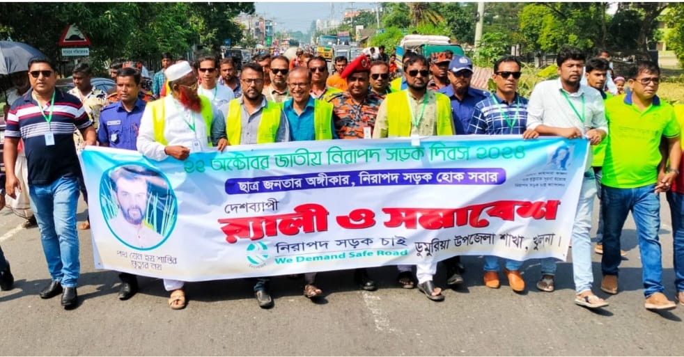 ছাত্র জনতার অঙ্গীকার নিরাপদ সড়ক হোক সবার" এই প্রতিপাদ্যকে সামনে রেখে খুলনার ডুমুরিয়ায় নানা আয়োজনের মধ্য দিয়ে জাতীয় নিরাপদ সড়ক দিবস পালিত হয়েছে।