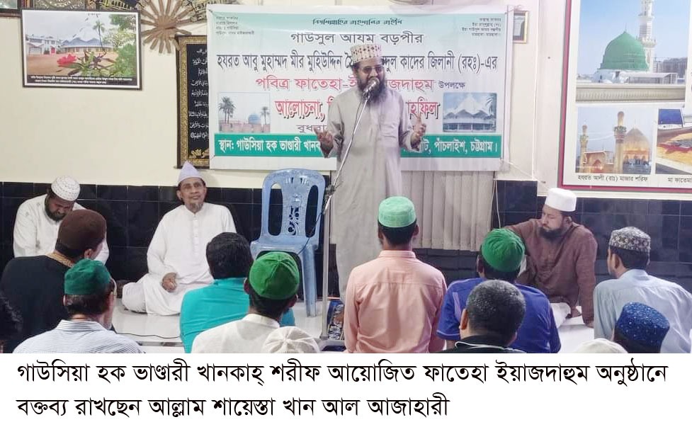 গাউসিয়া হক ভাণ্ডারী খানকাহ্ শরীফ এর উদ্যোগে প্রতি বছর এর ন্যায় গতকাল ২৩ অক্টোবর বুধবার বাদ মাগরিব গাউছে পাক মাহবুবে ছোবহানি কুতুবে রাব্বানী পীরে লাছানি বড়পীর আবু মোহাম্মদ মহিউদ্দিন আবদুল কাদের জিলানী (রহঃ) আল হাসানী ওয়াল হোসাইনি এর পবিত্র বার্ষিক উরশ মোবারক "পবিত্র ফাতেহা ইয়াজদাহুম" উপলক্ষে আলোচনা সভা, মিলাদ মাহফিল ও জিকিরে সেমা মাহফিল খানকাহ্ শরীফ প্রাঙ্গণে মোহাম্মদ আলীর সভাপতিত্বে অনুষ্ঠিত হয়। আলোচ্যবিষয় ছিল পবিত্র ফাতেহা ইয়াজদাহুম, কমিটির নবায়ন, কমিটির বার্ষিক কার্যক্রম প্রতিবেদন, বিবিধ।
