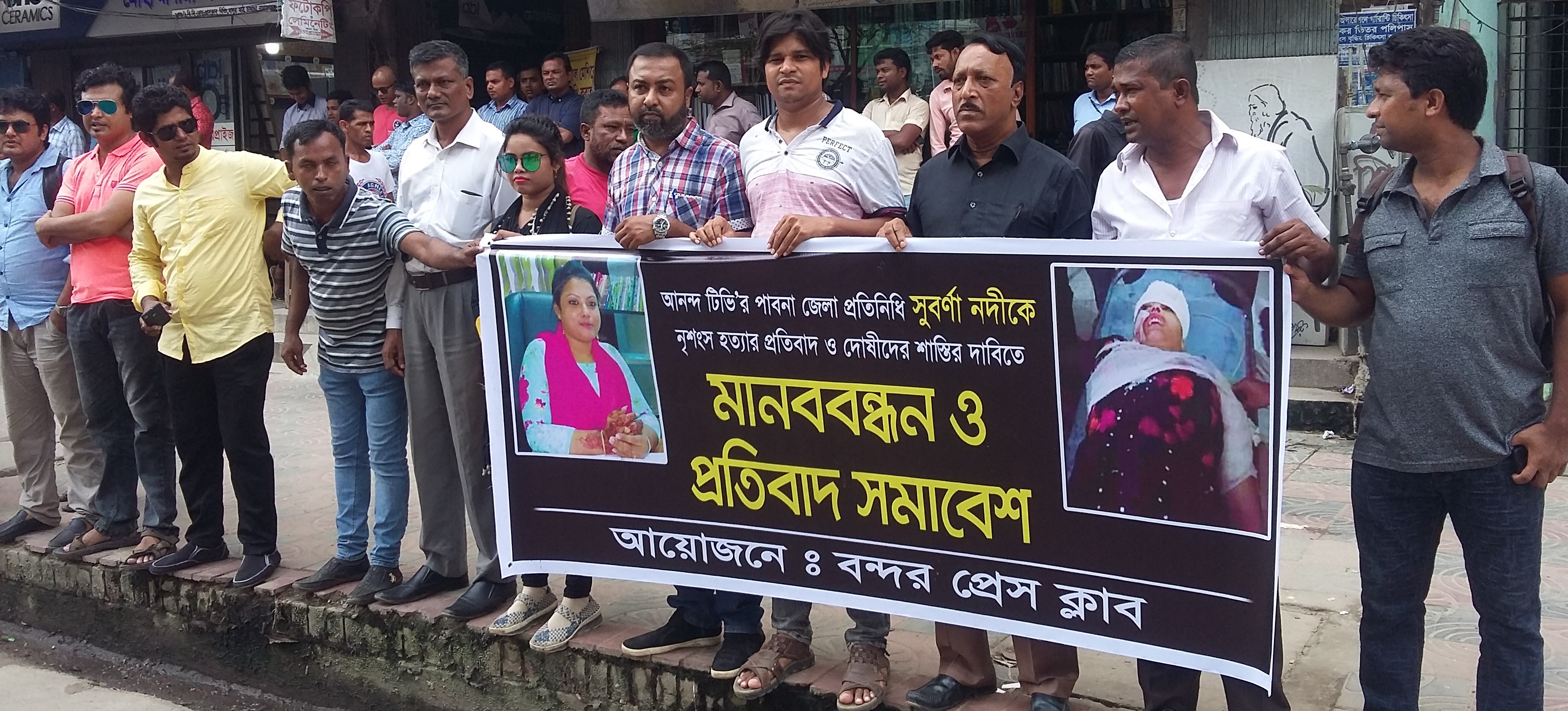 বেসরকারী টেলিভিশন আনন্দ টিভির পাবনা জেলা প্রতিনিধি সুবর্ণা নদীকে হত্যার প্রতিবাদে নারায়নগঞ্জ প্রেসক্লাবের সামনে মানববন্ধন করেছেন সাংবাদিকরা। একদল সন্ত্রাসী গত মঙ্গলবার রাত আনুমানিক ১০ টার দিকে সাংবাদিক সুবর্ণা নদীকে তাঁর বাসায় এসে কুপিয়ে হত্যা করে। সাংবাদিক সুবর্ণা নদী আনন্দ টিভির পাবনা জেলা প্রতিনিধি ছিলেন এবং অনলাইন পোর্টাল জাগ্রত বাংলার প্রকাশক ও সম্পাদক ছিলেন। সাংবাদিককে হত্যার দুদিন অতিবাহিত হলেও হত্যার মূল রহস্য উদঘাটন করতে পারেনি পুলিশ। এদিকে সাংবাদিক নদীর হত্যার প্রতিবাদে সারা দেশে মানববন্ধন করছেন সাংবাদিকরা। উত্তাল হয়ে উঠেছে দেশ। বৃহস্পতিবার সকাল ১০ টার দিকে নারায়নগঞ্জ প্রেসক্লাবের সামনে মানববন্ধনে সাংবাদিকরা বলেন, দীর্ঘদিন যাবৎ সাংবাদিকদের হত্যা, মিথ্যা মামলা, হামলা করে রাজত্ব কায়েম করছে অপরাধীরা। অপরাধীদের অপকর্মের বিরুদ্ধে সংবাদ প্রকাশ করা অনেক সংবাদকর্মীদের হয়রানিসহ প্রাননাশের হুমকি দিয়ে আসছে সন্ত্রাসীরা। পাবনায় আনন্দ টিভির জেলা প্রতিনিধিকে নির্মম ভাবে কুপিয়ে হত্যা করেছে সন্ত্রাসীরা। এখনো পর্যন্ত হত্যার রহস্য উদঘাটন করতে পারেনি পুলিশ। সাংবাদিকরা আরো বলেন, অপরাধীদের সাথে পুলিশের ভালো সর্ম্পক থাকার কারনে অপরাধীরা বিভিন্ন অপকর্ম করার সাহস পাচ্ছে। এ পর্যন্ত যত সাংবাদিক হত্যার শিকার হয়েছে একটিও বিচার হয়নি। তাই অপরাধীরা দিনদিন আরো বেপরোয়া হয়ে উঠেছে। এখনো পর্যন্ত সাগর রুনির হত্যা কোন বিচারের ব্যবস্থা করতে পারেনি প্রশাসন। সাংবাদিকরা হুশিয়ারী করে বলে সাংবাদিক হত্যার বিচার, সাংবাদিকদের বিরুদ্ধে মিথ্যা মামলা প্রত্যাহার এবং কুখ্যাত সন্ত্রাসীদের কঠোর বিচার যদি করার না হয় তাহলে সাংবাদিকরা রাজপথে এসে কঠোর আন্দোলন করবে বলে জানান।