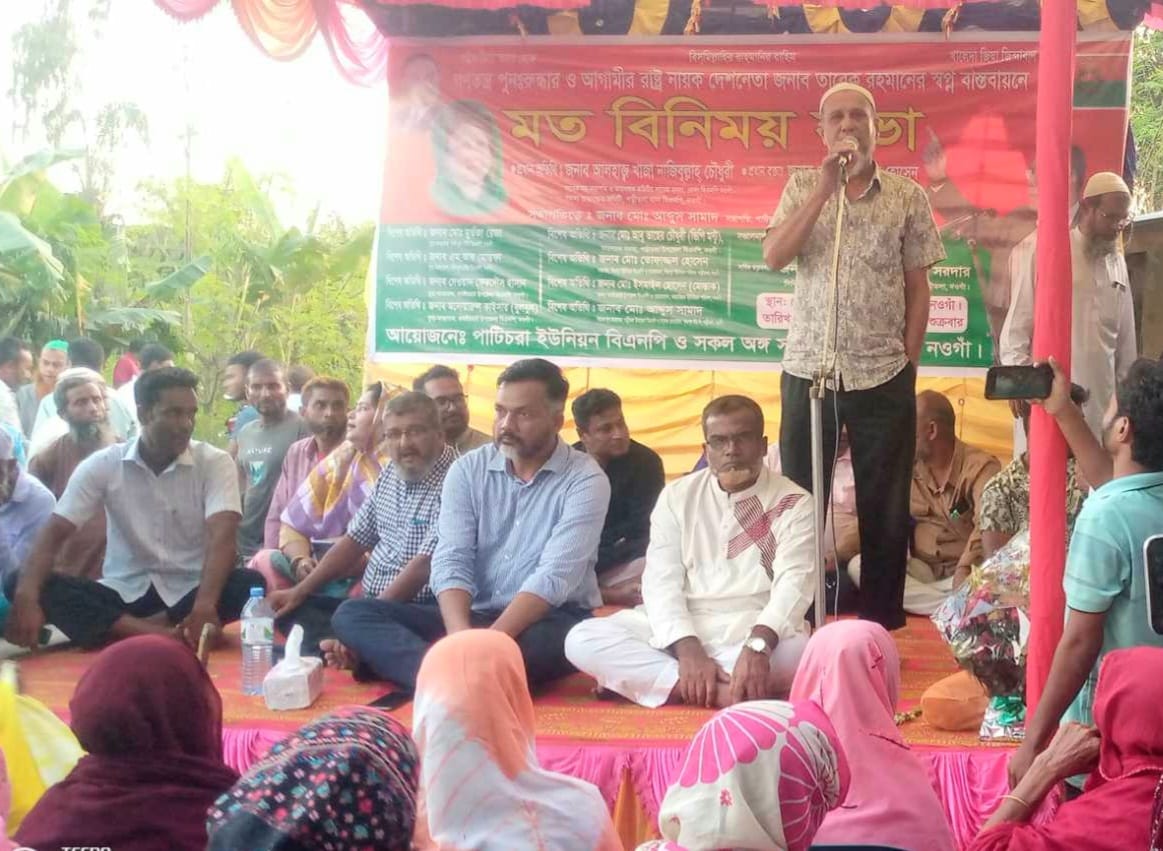 উপজেলার পাটিচড়া ইউনিয়ন বিএনপি'র আয়োজনে এক মত বিনিময় সভা অনুষ্ঠিত হয়েছে। বিকেল ৪ টায় পত্নীতলা উপজেলার পাটিচড়া ইউনিয়ন বিএনপি’র আয়োজনে মোবারকপুর বাজারে গণতন্ত্র পুনু:রুদ্ধান ও আগামীর রাষ্ট্র নায়ক দেশ নেতা মো: তারেক রহমানের স্বপ্ন বাস্তবায়নে এক মত বিনিময় সভা অনুষ্ঠিত হয়েছে।