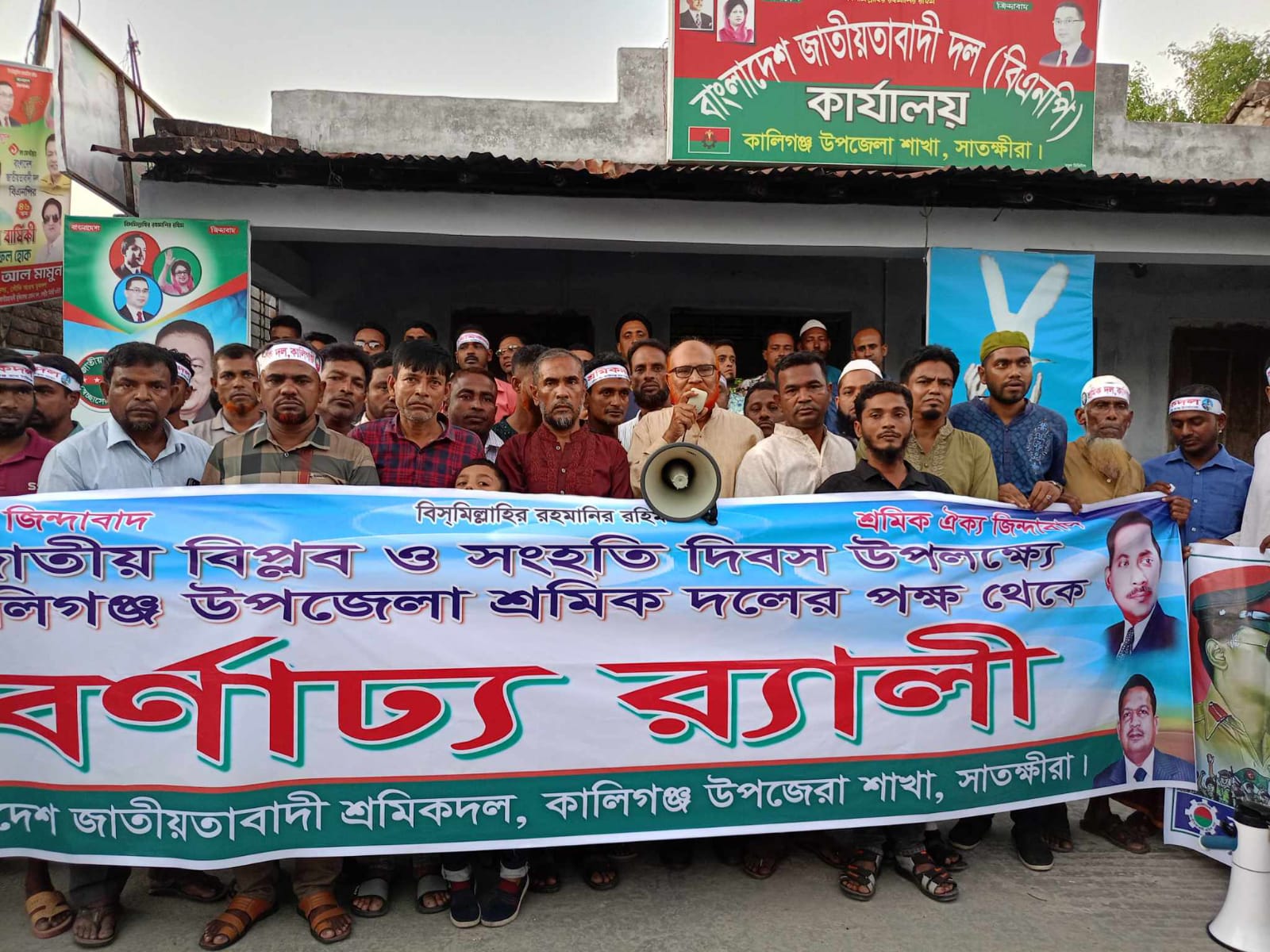 সাতক্ষীরার কালিগঞ্জ উপজেলায় জাতীয় বিপ্লব ও সংহতি দিবস পালন উপলক্ষে বিশাল র্যালী ও আলোচনা সভা অনুষ্ঠিত হয়েছে। শনিবার (৯ নভেম্বর) বিকেলে উপজেলা শ্রমিক দলের আয়োজনে বিএনপি কার্যালয়ের সামনে অনুষ্ঠিত আলোচনা সভায় উপজেলা শ্রমিক দলের সভাপতি আব্দুস সেলিম এর সভাপতিত্বে ও সাধারণ সম্পাদক শোকর আলীর সঞ্চালনায় প্রধান অতিথির বক্তব্য রাখেন কালিগঞ্জ উপজেলা বিএনপি'র আহবায়ক সাবেক ইউপি চেয়ারম্যান শেখ এবাদুল ইসলাম, বিশেষ অতিথির বক্তব্য রাখেন সদস্য সচিব ডাঃ শেখ শফিকুল ইসলাম বাবু, উপজেলা বিএনপি'র সাবেক দপ্তর সম্পাদক শেখ খায়রুল আলম, উপজেলা ছাত্রদলের সাবেক সভাপতি শেখ মোজাফফার হোসেন, জেলা শ্রমিক দলের সাংগঠনিক সম্পাদক মিয়ারাজ হোসেন, উপজেলা স্বেচ্ছাসেবক দলের যুগ্ন আহবায়ক আব্দুল আলিম বাবু, শ্রমিক দলের সহ- সভাপতি আব্দুল কুদ্দুস, সাংগঠনিক সম্পাদক সিরাজুল ইসলাম রাজু, যুগ্ম সাধারণ সম্পাদক আমজেদ আলী সরদার, উপজেলা তাঁতী দলের যুগ্ন আহবায়ক আব্দুল আলিম, উপজেলা তাতিদলের সদস্য সচিব ফারুক হোসেন প্রমুখ। দিবসটি পালন উপলক্ষে উপজেলার বাসস্ট্যান্ড থেকে বর্ণাঢ্য র্যালী সহকারে বিএনপি কার্যালয়ে এসে শেষ হয়। উপজেলার ১২টি ইউনিয়ন থেকে শ্রমিকদলের নেতৃত্বে খন্ড খন্ড মিছিলে নেতাকর্মীরা অংশগ্রহণ করেণ।