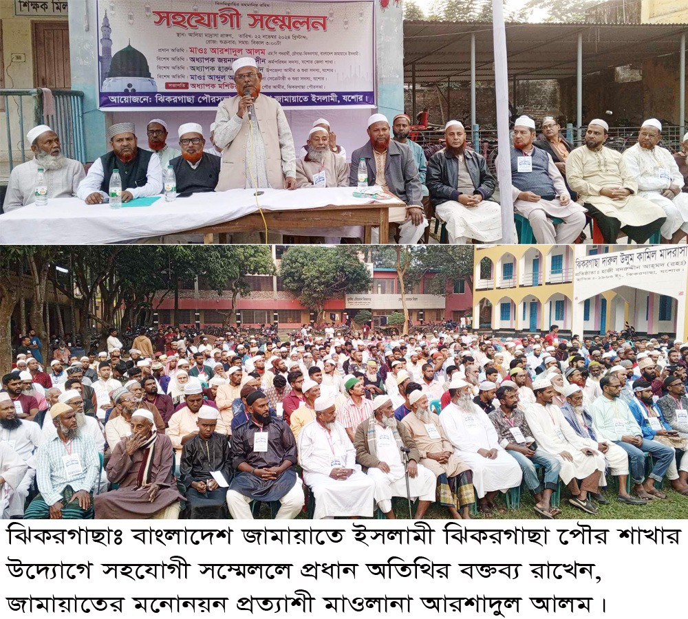 বাংলাদেশ জামায়াতে ইসলামী শাখার উদ্যোগে সহযোগী সম্মেলন অনুষ্ঠিত হয়েছে। শুক্রবার (২২জুলাই) বিকেলে ঝিকরগাছা দারুল উলুম কামিল মাদরাসা মাঠে অনুষ্ঠিত সহযোগী সম্মেলনে সভাপতিত্ব করেন, পৌর আমীর অধ্যাপক মশিউর রহমান। অনুষ্ঠানে প্রধান অতিথির বক্তব্য রাখেন, যশোর-২ আসনের জামায়াতের মনোনয়ন প্রত্যাশী, জামায়াতে ইসলামী যশোর জেলা পশ্চিম শাখার সাবেক সেক্রেটারী মাওলানা আরশাদুল আলম। অনুষ্ঠানে বিশেষ অতিথির বক্তব্য রাখেন, সাবেক উপজেলা ভাইস চেয়ারম্যান অধ্যাপক জয়নাল আবেদীন, ঝিকরগাছা উপজেলা আমীর অধ্যাপক হরুন অর রশীদ, সেক্রেটারি মাওলানা আব্দুল আলিম। এসময় উপস্থিত ছিলেন, এম এল মডেল হাইস্কুলের অবসরপ্রাপ্ত প্রধান শিক্ষক এস এম মাহবুবুল আলম মন্টু, সেন্টলুইস মাধ্যমিক বিদ্যালয়ের অবসরপ্রাপ্ত প্রধান শিক্ষক জাহিদুল ইসলাম, রঘুনাথনগর মাধ্যমিক বিদ্যালয়ের প্রধান শিক্ষক হাসানুল বান্না, বোধখানা মাধ্যমিক বিদ্যালয়ের প্রধান শিক্ষক একরামুল্লাহ স্বপন, জামায়াতের উপজেলা কর্মপরিষদ সদস্য আবিদুর রহমান, পৌর সেক্রেটারি আব্দুল কাদের, জামায়াত নেতা আব্দুল হামিদ, আতিকুজ্জামান পলাশ, রবিউল ইসলামসহ বিভিন্ন নেতৃবৃন্দ।