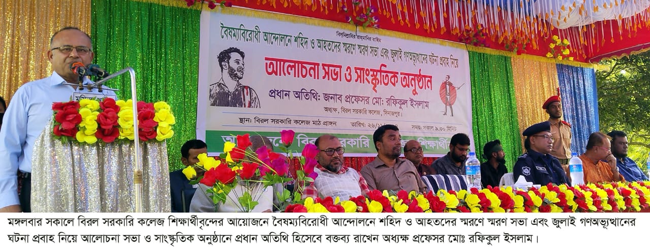 বিরল সরকারি কলেজ শিক্ষার্থীবৃন্দের আয়োজনে বৈষম্যবিরোধী আন্দোলনে শহিদ ও আহতদের স্মরণে স্মরণ সভা এবং জুলাই গণঅভ্যূত্থানের ঘটনা প্রবাহ নিয়ে আলোচনা সভা ও সাংস্কৃতিক অনুষ্ঠান অনুষ্ঠিত হয়েছে। মঙ্গলবার সকালে কলেজ মাঠে আয়োজিত অনুষ্ঠানে প্রধান অতিথি হিসেবে বক্তব্য রাখেন, বিরল সরকারি কলেজ এর অধ্যক্ষ প্রফেসর মোঃ রফিকুল ইসলাম। বিশেষ অতিথি হিসেবে বক্তব্য রাখেন, থানার অফিসার ইনচার্জ মোঃ আব্দুস ছবুর। অন্যান্যদের মধ্যে বিরল সরকারি কলেজ এর সমাজ বিজ্ঞান বিভাগের বিভাগীয় প্রধান জেষ্ঠ্য প্রভাষক জর্জিসুর আলম, রাষ্ট্র বিজ্ঞান বিভাগের বিভাগীয় প্রধান মারুফুল ইসলাম, হিসাব বিজ্ঞান বিভাগের বিভাগীয় প্রধান মেহেরুল ইসলাম, ইসলামের ইতিহাস ও সংস্কৃতি বিভাগের বিভাগীয় প্রধান সাইদুর রহমান, ব্যবস্থাপনা বিভাগের বিভাগীয় প্রধান মোঃ আনোয়ার হোসেন, শিক্ষক পরিষদের সাধারণ সম্পাদক মোঃ সাইফুল ইসলাম, ছাত্র প্রতিনিধি হারুন অর রশিদ, মেহেদী হাসান, আলী আহসান মোহাম্মদ মুজাহিদ, জিসান, রিফাত, রাহেনুর ইসলাম, বিরল প্রেস ক্লাবের আহ্বায়ক আতিউর রহমান প্রমূখ বক্তব্য রাখেন। অনুষ্ঠান সঞ্চালনা করেন শিক্ষার্থী মোঃ রাশেদুল ইসলাম। বৈষম্যবিরোধী আন্দোলনে অত্র কলেজ মাঠে শহিদ ও আহতদের স্মরণে স্মরণ সভা এবং জুলাই গণঅভূত্থানের ঘটনা প্রবাহ নিয়ে আলোচনা সভা শেষে সাংস্কৃতিক অনুষ্ঠান পরিবেশন করেন শিক্ষার্থীবৃন্দ।