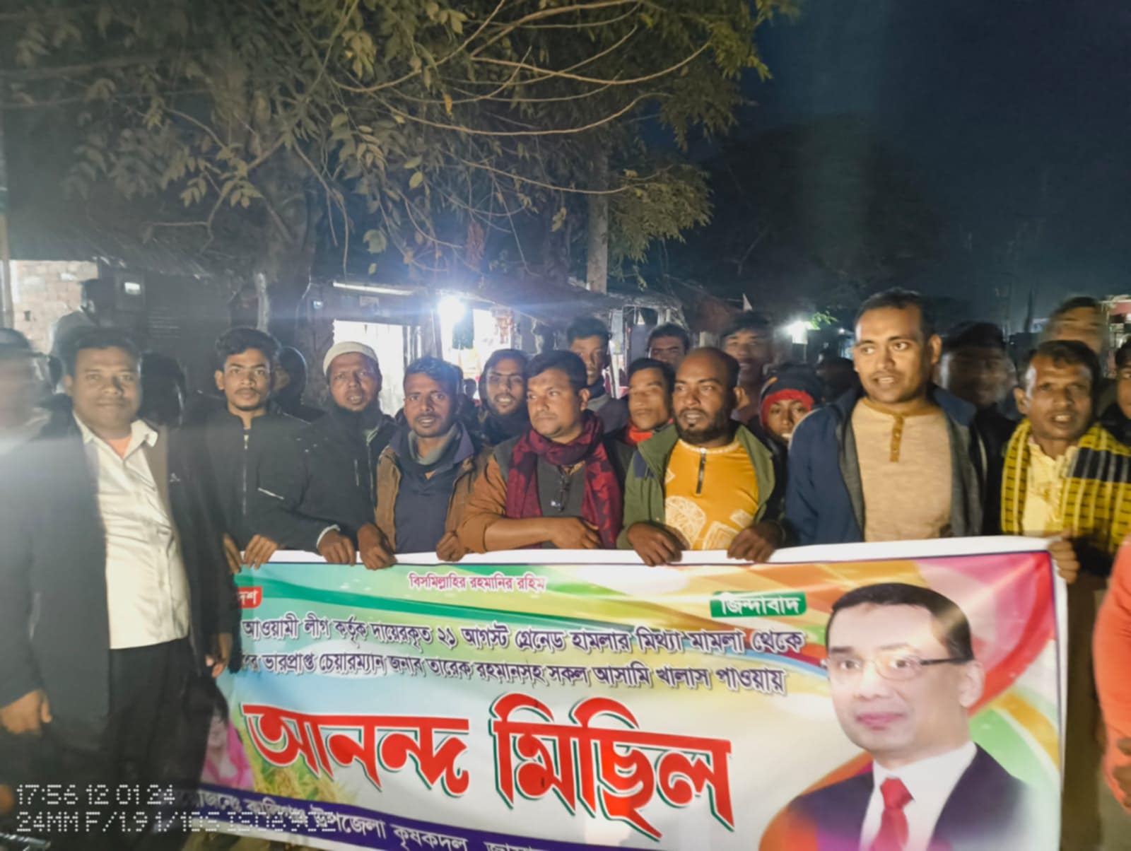 রবিবার (১লা ডিসেম্বর) সন্ধ্যায় ফ্যাসিস্ট আওয়ামী সরকার কর্তৃক দায়েরকৃত কল্পিত ২১ আগস্ট গ্রেনেড হামলার মিথ্যা মামলা থেকে বিএনপির ভারপ্রাপ্ত চেয়ারম্যান জননেতা তারেক রহমানসহ সকল আসামি খালাস পাওয়ায় তাৎক্ষণিক আনন্দ মিছিল অনুষ্ঠিত হয়েছে। কালিগঞ্জ উপজেলা কৃষকদল, জাসাস, ছাত্রদল, স্বেচ্ছাসেবক দল, সৈনিকদল, তাতীদলের, শ্রমিকদলের যৌথ আয়োজনে আনন্দ মিছিলে উপস্থিত ছিলেন কালিগঞ্জ উপজেলা তাতীদলের সদস্য সচিব ফারুক হোসেন, শ্রমিক দলের সদস্য সচিব শোকর আলী, কৃষকদলের আহ্বায়ক রোকনুজ্জামান, সদস্য সচিব আরিফুর রহমান ছোটন, সিনিঃ যুগ্ন আহ্বায়ক কামরুজ্জামান, উপজেলা জাসাস এর আহ্বায়ক মুরশিদ আলী, সিনিঃযুগ্ন আহ্বায়ক শাহাজান আলী, সদস্য সচিব মারুফ বিল্লাহ, স্বেচ্ছাসেবক দলের যুগ্ম আহ্বায়ক কাজী শরিফুল ইসলাম, ছাত্রদলের দক্ষিণ ইউনিয়নে সিনিঃসহ সভাপতি জাকির সৈনিক দলের আহ্বায়ক সোহাগ, তরুণ দলের সিনিঃ সাধারন সম্পাদক ওমর, কৃষকদলের যুগ্ম আহ্বায়ক শরিফুল হালদার, তাতীদলের যুগ্ম আহ্বায়ক আঃআলীম, যুগ্ম আহ্বায়ক আবু হাসান প্রমুখ।