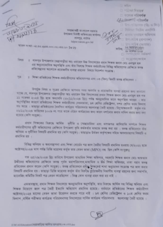 নাটোরের লালপুর উপজেলার দুড়দুড়িয়া ইউনিয়নে অবস্থানরত ভেল্লাবাড়িয়া আব্দুল ওয়াহেদ উচ্চ বিদ্যালয়ের প্রধান শিক্ষক এনামুল হকের ক্ষমতার দাপটে শিক্ষক-কর্মচারীরা অতিষ্ঠ হয়ে তাঁর বিরুদ্ধে বিভিন্ন ধরনের অনিয়ম-দুর্নীতি তুলে ধরে শিক্ষক-কর্মচারীরা স্বাক্ষর করে লালপুর উপজেলা নির্বাহী অফিস সহ বিভিন্ন শিক্ষা দপ্তরে একাধিক লিখিত অভিযোগ দায়ের করলে উক্ত অভিযোগ গুলো আমলে নিয়ে তদন্ত করে এবং তদন্ত প্রতিবেদেন উর্ধতন কর্মকর্তা/দপ্তর বরাবর পাঠানো হয়েছে।