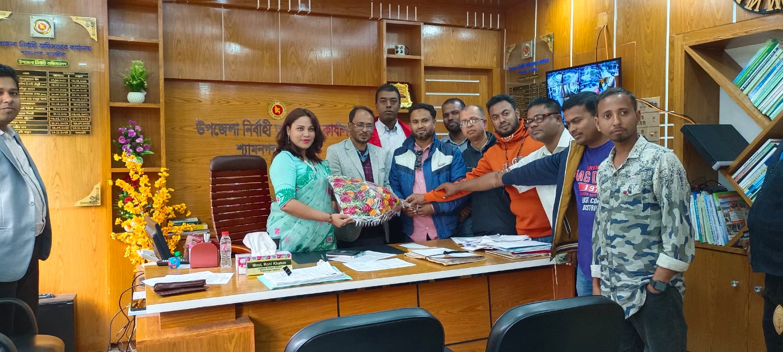 সাতক্ষীরা শ্যামনগর উপজেলা নির্বাহী কর্মকর্তা মোছাঃ রনি খাতুন এর সাথে বুধবার সকালে বাংলাদেশ রিপোর্টার্স ক্লাবের অনুমোদিত শ্যামনগর উপজেলা রিপোর্টার্স ক্লাবের নেতৃবৃন্দ মতবিনিময় করেছেন। এ সময় তারা ইউএনওকে ফুলের শুভেচ্ছা জানান। এ সময় উপস্থিত ছিলেন, শ্যামনগর উপজেলা সহকারী কমিশনার (ভূমি) মোঃ আব্দুল্লাহ আল রিফাত শ্যামনগর উপজেলা রিপোর্টার্স ক্লাবের সভাপতি ,সাবেক কাউন্সিলর দি ডেলি ইভিনিং নিউজ, জাতীয় দৈনিক আলোকিত সকাল ও বাংলাদেশ সমাচার পত্রিকার প্রতিনিধি সিনিয়র সাংবাদিক এসকে সিরাজ, সহ-সভাপতি, জাতীয় দৈনিক ইনকিলাব ও ডেইলি পোস্ট এর প্রতিনিধি মোঃ রবিউল ইসলাম, সহ-সভাপতি, জাতীয় দৈনিক মুক্ত খবরের প্রতিনিধি আব্দুল্লাহ আল মামুন, সাধারণ সম্পাদক দৈনিক খুলনা প্রতিদিনের প্রতিনিধি ইয়াসিন আরাফাত, কার্যনির্বাহী সদস্য , জাতীয় দৈনিক কালের কন্ঠ ও দৈনিদ পত্রদূত পত্রিকার প্রতিনিধি মোঃ আজিজুর রহমান, যুগ্ম সাধারণ সম্পাদক জাতীয় দৈনিক প্রতিদিনের সংবাদ পত্রিকার প্রতিনিধি মনিরুজ্জামান মিশুক, কার্যনির্বাহী সদস্য জাতীয় দৈনিক মানবকন্ঠ ও সাতনদী পত্রিকার প্রতিনিধি ডাঃ জিয়াউর রহমান, দপ্তর সম্পাদক দৈনিক সু -প্রভাত ও ভয়েজ অফ সুন্দরবন এর প্রতিনিধি রাজু আহমেদ , প্রচার সম্পাদক দৈনিক সোনালী বার্তা ও ভয়েজ অফ সুন্দরবনের স্টাফ রিপোর্টার রাইসুল মিথুন সহ অন্যান্য সাংবাদিকবৃন্দ। এ সময় উপজেলা নির্বাহী কর্মকর্তা শ্যামনগর উপজেলাকে একটি মডেল উপজেলায় রূপান্তরিত করতে সাংবাদিকদের সহযোগিতা কামনা করেন।