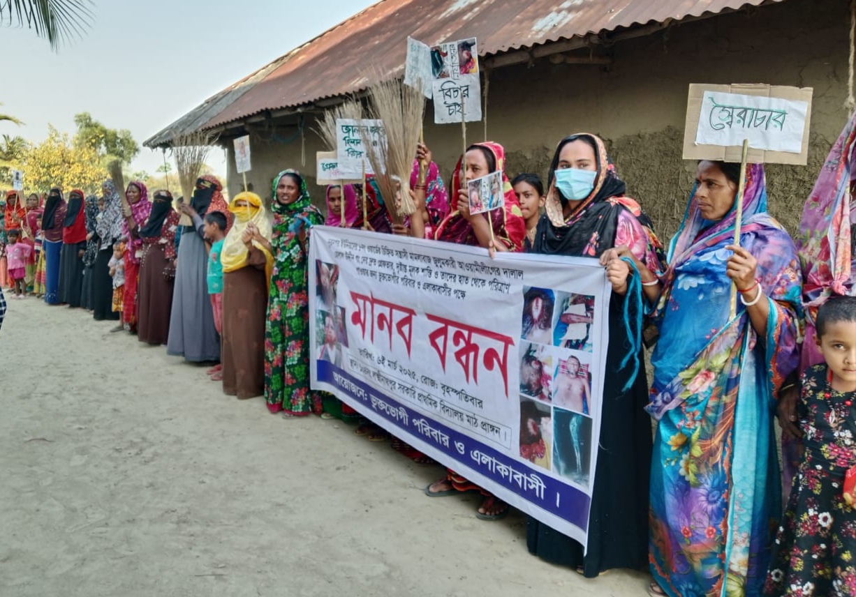 সাতক্ষীরার শ্যামনগর উপজেলার নুরনগর ইউনিয়নের ৮ নং ওয়ার্ডের চিহ্নিত সন্ত্রাসী মামলাবাজ জুলুমকারী আওয়ামীলীগের দালাল হেলাল উদ্দীন গংদের দ্রæত গ্রেফতার , দৃষ্টান্ত মূলক শাস্তি ও তাদের হাত থেকে পরিত্রান পাওয়ার জন্য ভুক্তভোগীর পরিবার ও এলকাবাসীর পক্ষে মানব বন্ধন অনুষ্ঠিত হয়েছে। ০৬ ই মার্চ ( বৃহস্পতিবার ) বিকাল চার টায় ১০৪ নং লক্ষèীনাথপুর সরকারি প্রাথমিক বিদ্যালয় মাঠ প্রাঙ্গনে উক্ত মানব বন্ধন অনুষ্ঠিত হয়। মানব বন্ধনে বক্তব্য রাখেন আলহাজ্ব হযরত মাওলানা মোঃ নজরুল ইসলাম, নিমাই চন্দ্র মন্ডল , মোঃ রেজাউল করিম , মোছাঃ খাদিজা বেগম। মানব বন্ধনে ভুক্তিভোগী পরিবার বলেন , শ্যামনগর উপজেলার নুরনগর ইউনিয়নের মীর্জাপুর গ্রামের জহুর আলী গাজীর পুত্র হেলাল উদ্দীন , মৃত সোহরাব আলী গাজীর পুত্র জহুর আলী গাজী , লক্ষœীনাথ গ্রামের এবাদুল গাজীর পুত্র আব্দুস সালাম , রমজাননগর ইউনিয়নের হরিনাগাড়ীর জাকির হোসেন ছোট , মৃত সোহরাব আলী গাজীর পুত্র জালালউদ্দীন গাজী, আনোয়ার মোড়লের পুত্র মাহবুবুর রহমান , আব্দুল আজিজ খোকনের পুত্র মোহাম্মাদ আলী , মোস্তফা মিস্ত্রীর পুত্র পিয়ার আলী মিস্ত্রী চিহ্নিত সন্ত্রাসী মামলাবাজ জুলুমকারী আওয়ামীলীগের দালাল। তারা প্রতিনিয়ত এলাকায় ত্রাসের সৃষ্টি করে চলেছে। তাদের ভয়ে এলাকার সাধারণ মানুষ আতঙ্কের ভিতরে দিন পার করছে। বিগত ০১ ই ফেব্রæয়ারী সকাল ১০.৩০ মিনিটে তারা দেশীয় অস্ত্র নিয়ে রমজাননগর গ্রামের মৃত আদম আলী শেখের পুত্র শেখ মুজিবর রহমানকে গুরুত্বর যখম করে। বিষয়টি নিয়ে মুজিবর রহমান শেখের পুত্র রেজাউল করিম গত ০২ ই ফেব্রæয়ারী শ্যামনগর থানায় মামলা দায়ের করেন। মামলা নং ১। মামলা দায়ের হওয়ার পর হেলাল উদ্দীনগং রেজাউলকে মামলা তুলে নেওয়ার জন্য বিভিন্ন ভাবে হুমকি ধামকি প্রদান করছে। বর্তমানে ভুক্তভোগী পরিবারসহ এলাকাবাসী আতঙ্কে আছে। মানব বন্ধন থেকে চিহ্নিত সন্ত্রাসীদের গ্রæত গ্রেফতারের দাবী করা হয়।