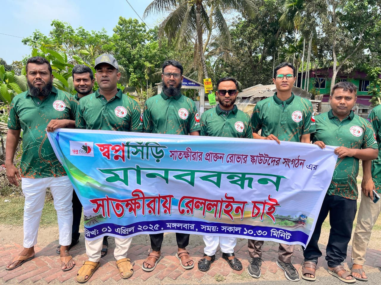 সাতক্ষীরায় রেললাইন স্থাপনের দাবিতে মানববন্ধন করেছে প্রাক্তন রোভার স্কাউটদের সংগঠন ‘স্বপ্নসিড়ি সাতক্ষীরা’। মঙ্গলবার (১ এপ্রিল ২০২৫) সকাল ১০টা ৩০ মিনিটে এ মানববন্ধন অনুষ্ঠিত হয়।
