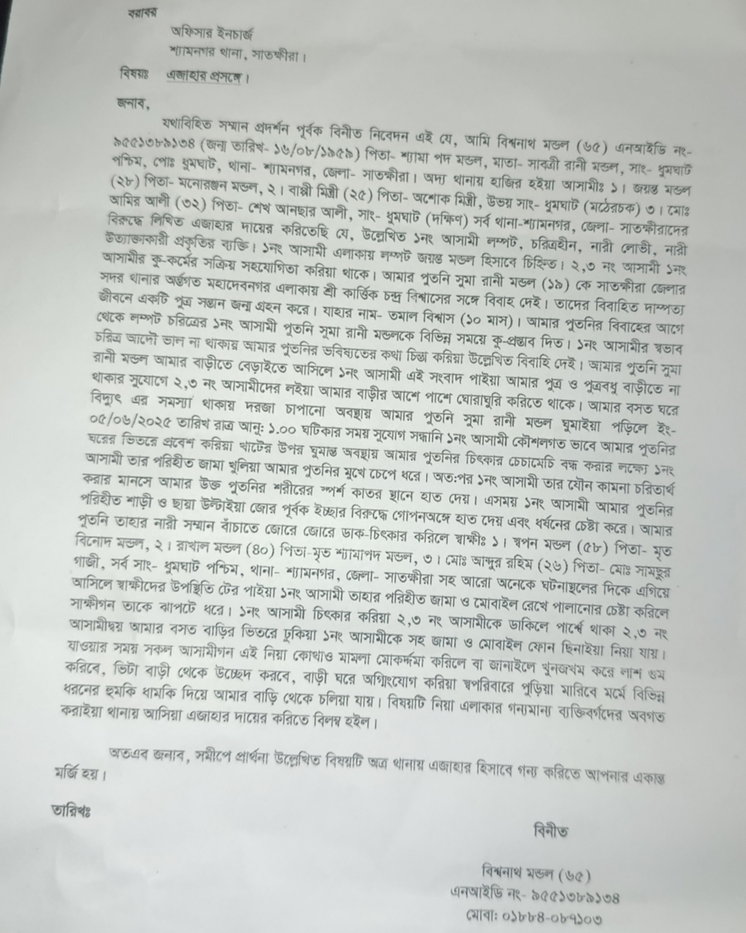 সুমা রাণী মন্ডল (১৯) কে সাতক্ষীরা জেলার সদর থানার অর্ন্তগত মহাদেবনগর এলাকায় শ্রী কার্ত্তিক চন্দ্র বিশ্বাসের স্ত্রী তার নানা রাড়িতে বেড়াতে আসে জয়ন্ত মন্ডল এই সংবাদ জানতে পারে তার মামা ওমামি বাড়িতে না থাকায় এই সুযোগে ২,৩ নং আসামী বাপ্পী মিস্ত্রী,মোঃ আমির আলী,তাদের বাড়ীর আশে পাশে ঘোরাঘুরি করিতে থাকে। এই সময় ঘরে বিদ্যুৎ এর সমস্যা থাকায় দরজা চাপানো অবস্থায় সুমা রানী মন্ডল ঘুমাইয়া পড়িলে ইং৫ জুন রাত্র আনু: ১.০০ ঘটিকার সময় এই ঘটনা ঘটে ১নং আসামী কৌশলগত ভাবে ঘরের ভিতরে প্রবেশ করে খাটের উপর ঘুমানো অবস্থায় চিৎকার চেচামেচি বন্ধ করার লক্ষ্যে ১নং আসামী তার পরিহীত জামা খুলে মুখে চেপে ধরে। এসময় আসামী জয়ন্ত মন্ডল জোর পূর্বক ইচ্ছার বিরুদ্ধে গোপন অঙ্গে হাত দেয় এবং ধর্ষনের চেষ্টা করে। সুমা রানী মন্ডল তার সম্মান বাঁচাতে জোরে জোরে ডাক-চিৎকার করিলে বাড়ি পাসের লোকজন জানতে পারে ১। স্বপন মন্ডল (৫৮) পিতা- মৃত বিনোদ মন্ডল, ২। রাখাল মন্ডল (৪০) পিতা মৃত শ্যামাপদ মন্ডল, ৩। মোঃ আব্দুর রহিম (২৬) পিতা- মোঃ সামপ্ল্যা গাজী, এরা সহ আরো অনেকে ঘটনাস্থলের দিকে এগিয়ে আসিলে আসামী তার পরিহীত জামা ও মোবাইল রেখে পালানোর চেষ্টা করিলে তাকে ঝাপটে ধরে। ১নং আসামী চিৎকার করে ২,৩ নং আসামীকে ডাকিলে পার্শ্বে থাকা ২,৩ নং আসামীদ্বয় বাড়ির ভিতরে ঢোকে ১নং আসামীকে সহ জামা ও মোবাইল ফোন ছিনিয়ে নিয়ে যায়। যাওয়ার সময় আসামীরা এই নিয়া কোখ্যও মামলা মোকদ্দমা না করাল মেরে ফেলার হুমকী দেই , । বিষয়টি নিয়া এলাকার গন্যমান্য ব্যক্তিবর্গদের অবগত করাইয়া থানায় এজাহার দায়ের করেন ভুক্তভোগীদের।
