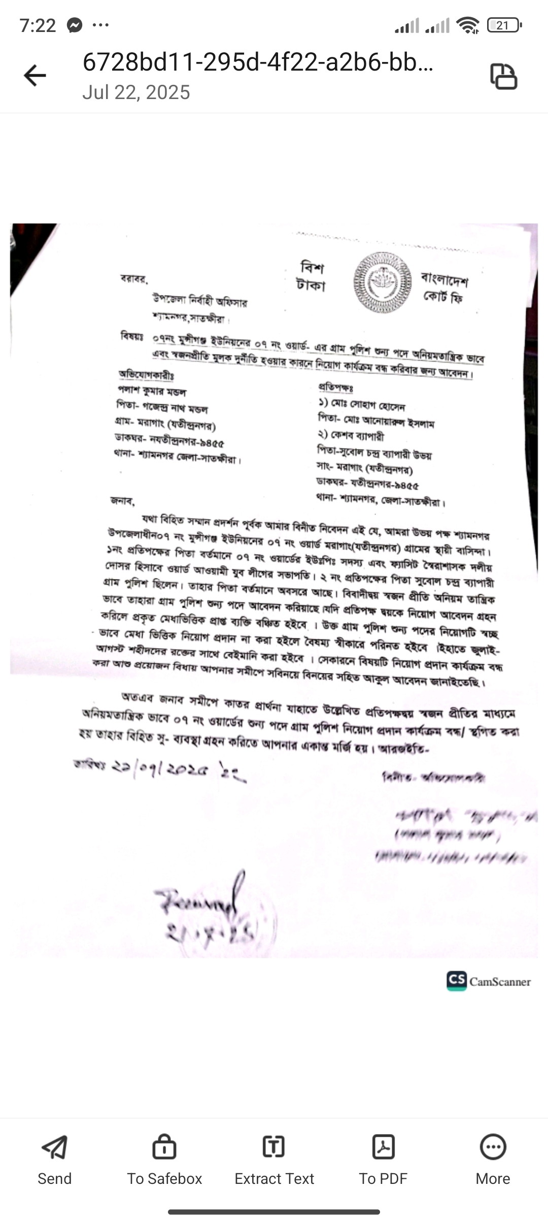 শ্যামনগর উপজেলার মুন্সিগঞ্জ ইউনিয়নের ৭নং ওযার্ড গ্রাম পুলিশ (মহল্লাদার) নিয়োগ পরীক্ষায় কাগজপত্র জাল ও তঞ্চকতার অভিযোগ উঠছে। এবিষয়ে ওই ওয়ার্ডের পলাশ কুমার মন্ডল বাদী হয়ে ২২ জুলাই গ্রাম পুলিশ নিয়োগ কমিটির সভাপতি উপজেলা নির্বাহী অফিসার বরাবর আবেদনকারীদের কাগজপত্র পুনরায় যাচাই ও নিয়োগ পরীক্ষা স্থগিত চেয়ে আবেদন করেছেন। অভিযোগ সূত্রে জানাযায়, মুন্সিগঞ্জ ইউনিয়নের ৭নং ওয়ার্ডের গ্রাম পুলিশ (মহল্লাদার) এর শুন্য পদে আবেদন চেয়ে ১২জানুয়ারী ২০২৫ তারিখে উপজেলা নির্বাহী অফিসার ও নিয়োগ কমিটির সভাপতি স্বাক্ষরিত নিয়োগ বিজ্ঞপ্তি প্রকাশ করেন। বিজ্ঞপ্তি অনুযায়ী অনেকে আবেদন পত্র দাখিল করেছেন। কিন্তু দীর্ঘপ্রতিক্ষার পর সম্প্রতি নিয়োগ যাচাই বাছাই কমিটি আবেদনকারীদের কাগজপত্র যাচাই বাছাই করে মরাগাং গ্রামের গজেন্দ্র মন্ডল এর পুত্র পলাশ কুমার মন্ডলের আবেদনটি হাতের লেখা না হয়ে কম্পিউটারে লেখা হওয়ায় বাতিল করে দেয়। অন্যদিকে মরাগাং গ্রামের ৭নং ওয়ার্ড আওয়ামী যুবলীগের সভাপতি ও ৭নং ওয়ার্ডের মেম্বর মোঃ আনোয়ারুল ইসলামের পুত্র মোঃ সোহাগ হোসেনে ও সুবোল চন্দ্র ব্যাপারীর পুত্র কেশব ব্যাপারীর কাগজপত্রে নানান জঠিলতা থাকার সত্তে¡ও তাহাদের আবেদন বৈধতা দেন যাচাই বাছাই কমিটি। সুবোল চন্দ্র ব্যাপারী জাতীয় পরিচয়পত্র অনুযায়ী বয়স ৫১ বছর সে জাতীয় পরিচয়পত্র গোপন রেখে জন্মনিবন্ধন দিয়ে আবেদন করেছেন। অভিযোগে আরও উল্লেখ করেছেন যে, সুবোল চন্দ্র ব্যাপারী নিয়োগ পাওয়ার জন্য বিভিন্ন মাধ্যমে ঘুষ বাণিজ্য সহ নিয়োগ পরীখ্ষা পাতানো ও ২জন নামমাত্র আবেদনকারী সাজিয়েছেন যাহাতে তিনি নিয়োগ পেতে পারেন। নিয়োগ পরীক্ষা বন্ধ না হলে প্রকৃত মেধাভিত্তিক প্রাপ্ত ব্যক্তিরা বঞ্চিত হবে। স্বচ্ছা ভাবে মেধা ভিত্তিক নিয়োগ প্রদান না করা হলে বৈষম্য স্বীকারে পরিণত হবে ইহাতে জুলাই আগস্টের শহীদদের রক্তের সাথে বেইমানী করা হবে। সকল আবেদনকারীর কাগজপত্র পুনরায় যাচাই বাছাই সহ নিয়োগ পরীক্ষা স্থগিত করে পুনরায় নিয়োগ বিজ্ঞপ্তি প্রকাশ করার জন্য তিনি উর্দ্ধতন কর্তৃপক্ষের দৃষ্টি আকর্ষন করেছেন।