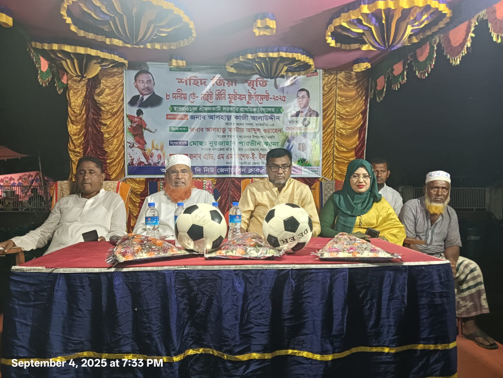 এ সময় বিশেষ অতিথি হিসাবে উপস্থিত ছিলেন সাবেক উপজেলা পরিষদের মহিলা ভাইস চেয়ারম্যান বিএনপি নেত্রী মোছাঃ নুর জাহান পারভীন ঝরনা। ৮দলীয় মিনি ফুটবল টুর্নামেন্ট খেলাটি সার্বিক ভাবে পরিচালনা করেন মাষ্টার মজনু ইলাহী।