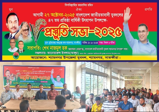 সাতক্ষীরার শ্যামনগর উপজেলায় যুবদলের ৪৭ তম প্রতিষ্ঠাবার্ষিকী উপলক্ষে শ্যামনগর উপজেলা যুবদলের প্রস্তুতি সভ-২০২৫ অনুষ্ঠিত হয়েছে। ১৮ অক্টোবর (শনিবার) উপজেলা যুবদলের ভারপ্রাপ্ত আহবায়ক জনাব শেখ নাজমুল হকের সভাপতিত্বে এবং সদস্য সচিব জনাব আনোয়ারুল ইসলাম আঙ্গুরের সঞ্চালনায় প্রস্তুতি সভা শুরু হয়। এ সময় অনুষ্ঠানে আরও উপস্থিত ছিলেন উপজেলা যুবদলের যুগ্ম আহবায়ক জনাব মজনু এলাহী, যুগ্ম আহবায়ক জনাব হাফিজ আল আসাদ কল্লোল, যুগ্ম আহবায়ক জনাব মতলেব হোসেন, যুগ্ম আহবায়ক জনাব খালিদ হাসান, যুগ্ম আহবায়ক জনাব হাজী হাসানুজ্জামান সহ ১২ টি ইউনিয়ন যুবদলের নেতৃবৃন্দ। অনুষ্ঠানে আমন্ত্রিত অতিথি হিসাবে উপস্থিত ছিলেন উপজেলা জাসাসের সাবেক সদস্য সচিব জনাব মোঃ রাইহানুল ইসলাম, সাবেক যুগ্ম আহবায়ক হুমায়ুন কবির লিটন, উপজেলা ছাত্রদলের সদস্য সচিব মোঃ আব্দুল্লাহ আল মামুন, যুগ্ম আহবায়ক জনাব গোলাম মোস্তফা সহ আরো অনেকে।