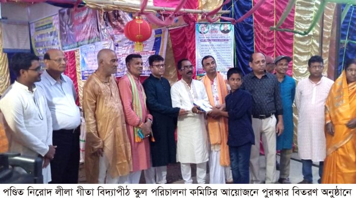 রিপোর্ট: স ম জিয়াউর রহমান পণ্ডিত নিরোদ লীলা গীতা বিদ্যাপীঠ স্কুল পরিচালনা কমিটির উদ্যোগে শারদীয় দুর্গোৎসবের বার্ষিক পুরস্কার বিতরণ অনুষ্ঠান দুর্গোৎসবের মহাসপ্তমী তিথিতে অনুষ্ঠিত হয়েছে। অনুষ্ঠানে সভাপতিত্ব করেন পণ্ডিত