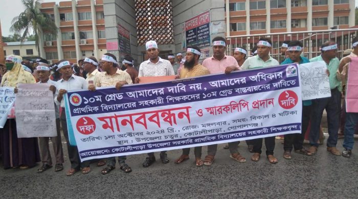 কোটালীপাড়া (গোপালগঞ্জ) প্রতিনিধি: – শেখ কামরুজ্জামান (রানা)। দশম গ্রেড বাস্তবায়নের এক দফা দাবিতে গোপালগঞ্জের কোটালীপাড়ায় মানববন্ধন করেছেন প্রাথমিক বিদ্যালয়ের সহকারী শিক্ষকরা। আজমঙ্গলবার বিকেল ৪ টায় উপজেলা পরিষদের সামনের