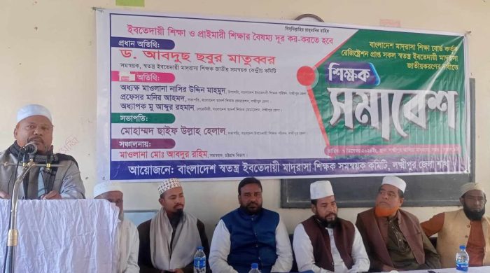 মোঃ নুর হোসেন(লক্ষ্মীপুর) প্রতিনিধিঃ লক্ষ্মীপুরে স্বতন্ত্র ইবতেদায়ী মাদ্রাসা সরকারি প্রাথমিক বিদ্যালয়ের ন্যায় জাতীয় করণের দাবিতে শিক্ষক সমাবেশ অনুষ্ঠিত হয়েছে। আজ ৭ ই ডিসেম্বর শনিবার সকাল ৯ টা লক্ষ্মীপুর